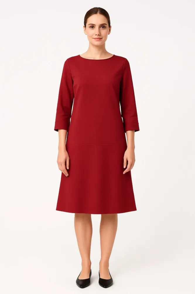 Повседневное платье Styleboom бордового цвета, лаконичный А-силуэт с рукавом 3/4 и длиной до колена. Подойдёт для офиса и повседневных выходов, легко сочетается с туфлями или ботильонами. Ткань с добавлением эластана немного тянется и комфортна в носке.