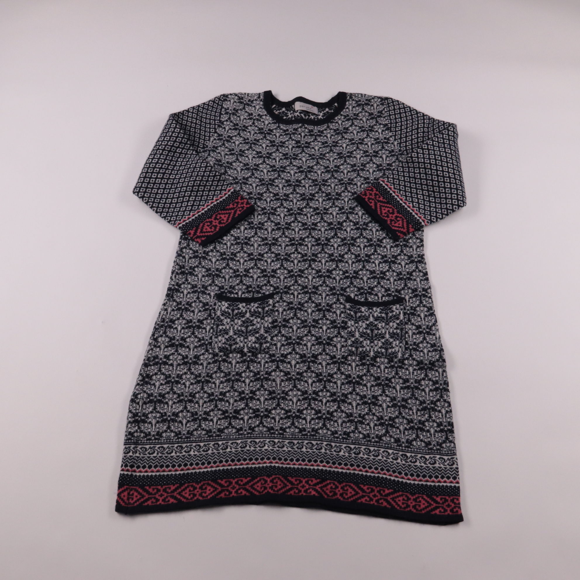 Вязаное повседневное платье Per Una (M&S) с жаккардовым узором и контрастной отделкой по манжетам и низу. Подойдёт для прохладной погоды и повседневных образов с ботинками или кедами. Мягкий смесовый трикотаж хорошо тянется и комфортно садится по фигуре.