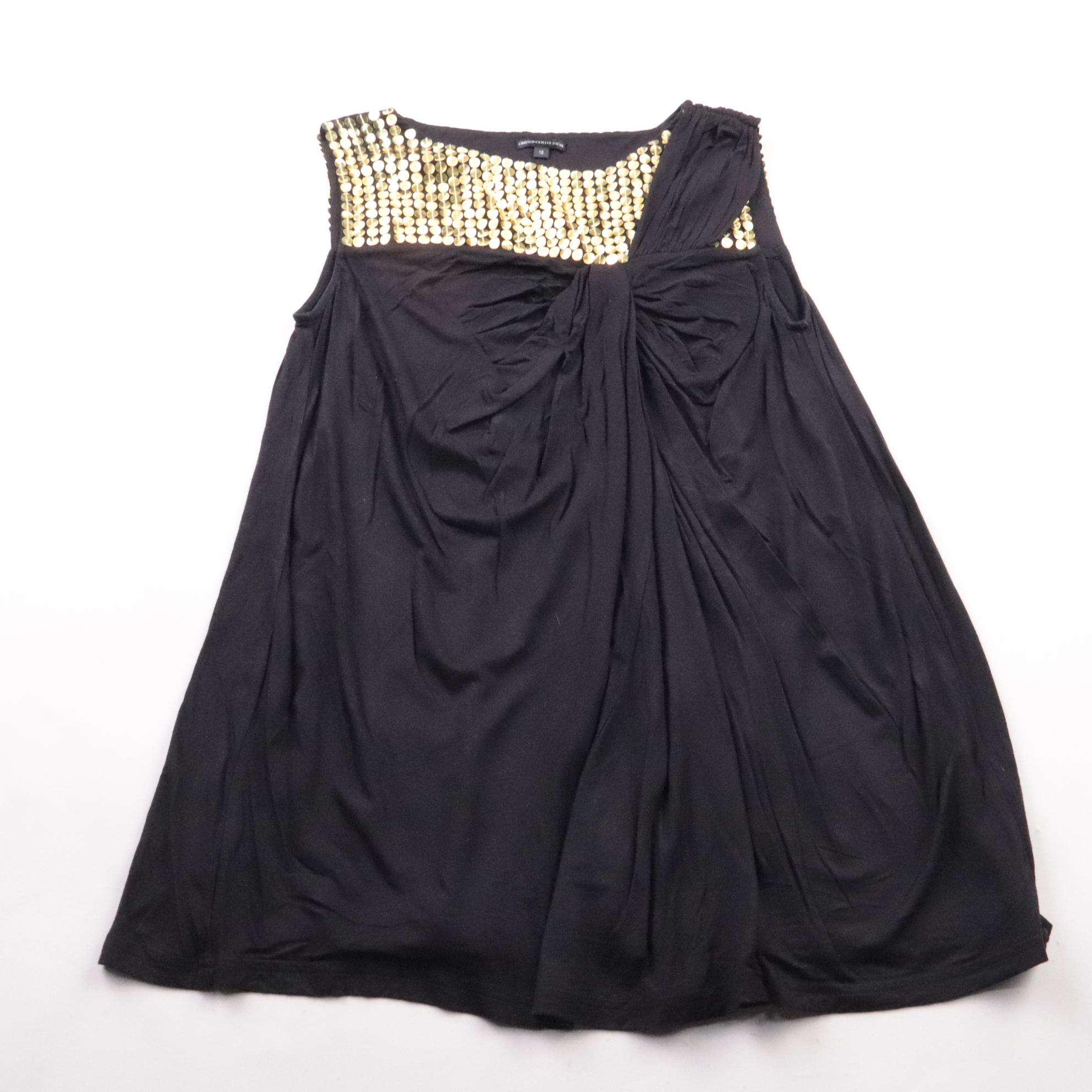 Чёрное платье Marks & Spencer Limited Collection с акцентной отделкой золотистыми пайетками по верху и драпировкой-узлом спереди. Подойдёт для вечера, праздника или выхода в ресторан, когда хочется лаконичный, но заметный образ. Мягкий трикотаж хорошо ...