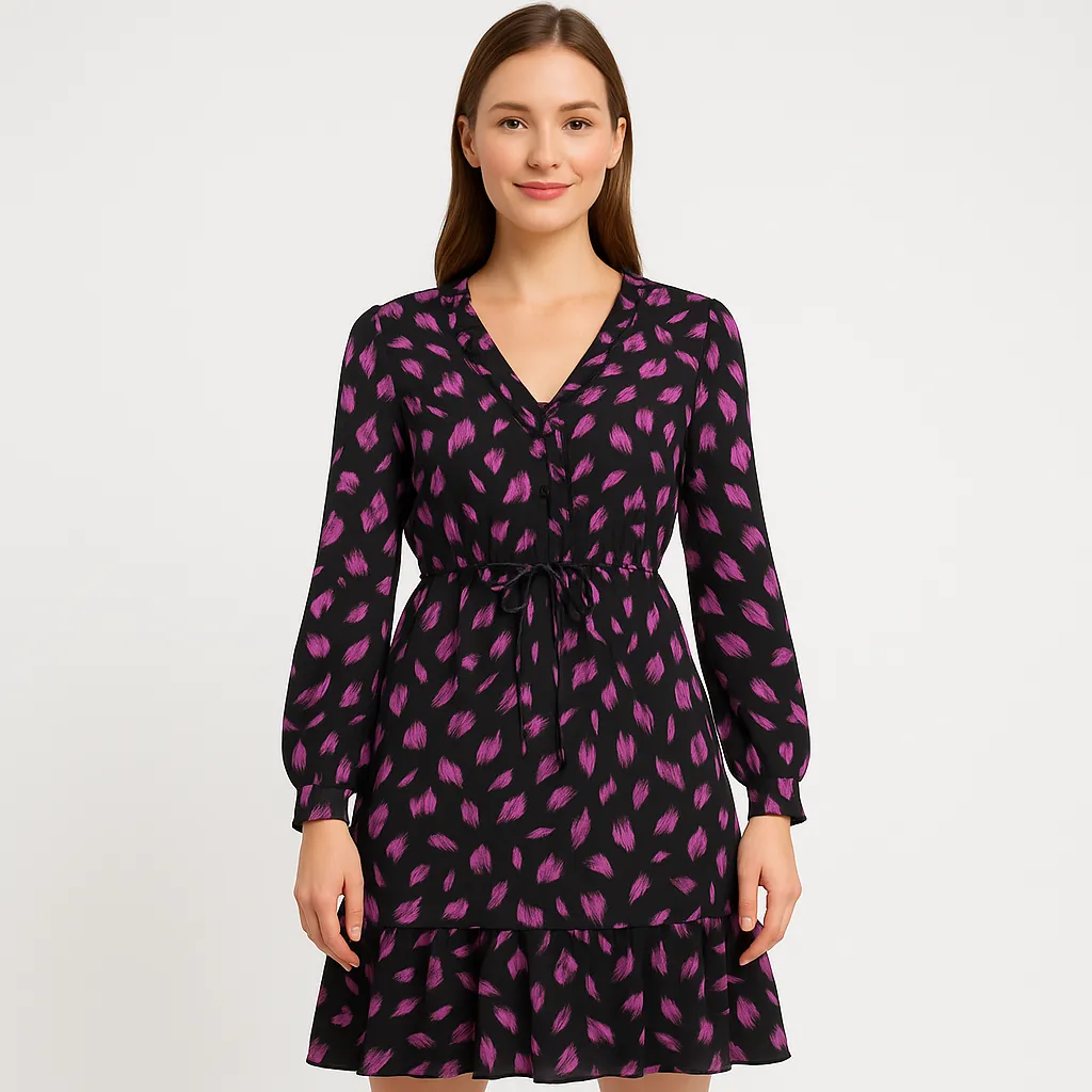 Повседневное платье Vila из лёгкой ткани с V-образным вырезом и длинными рукавами, чёрное с фиолетовым принтом. Подойдёт для офиса и прогулок, пояс на талии помогает регулировать посадку. Практично тем, что легко сочетать с ботинками, кедами и жакетом.