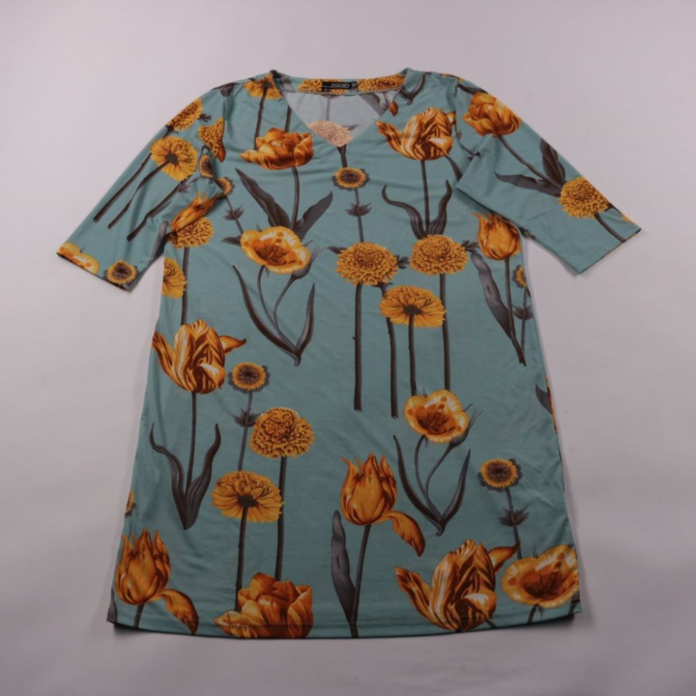 Повседневное платье Norah свободного кроя с рукавом 3/4 и ярким цветочным принтом на голубом фоне. Подойдёт для города и офиса в тёплое время года или как базовый слой с кардиганом в прохладные дни. Ткань тянется и почти не мнётся, удобно в носке.