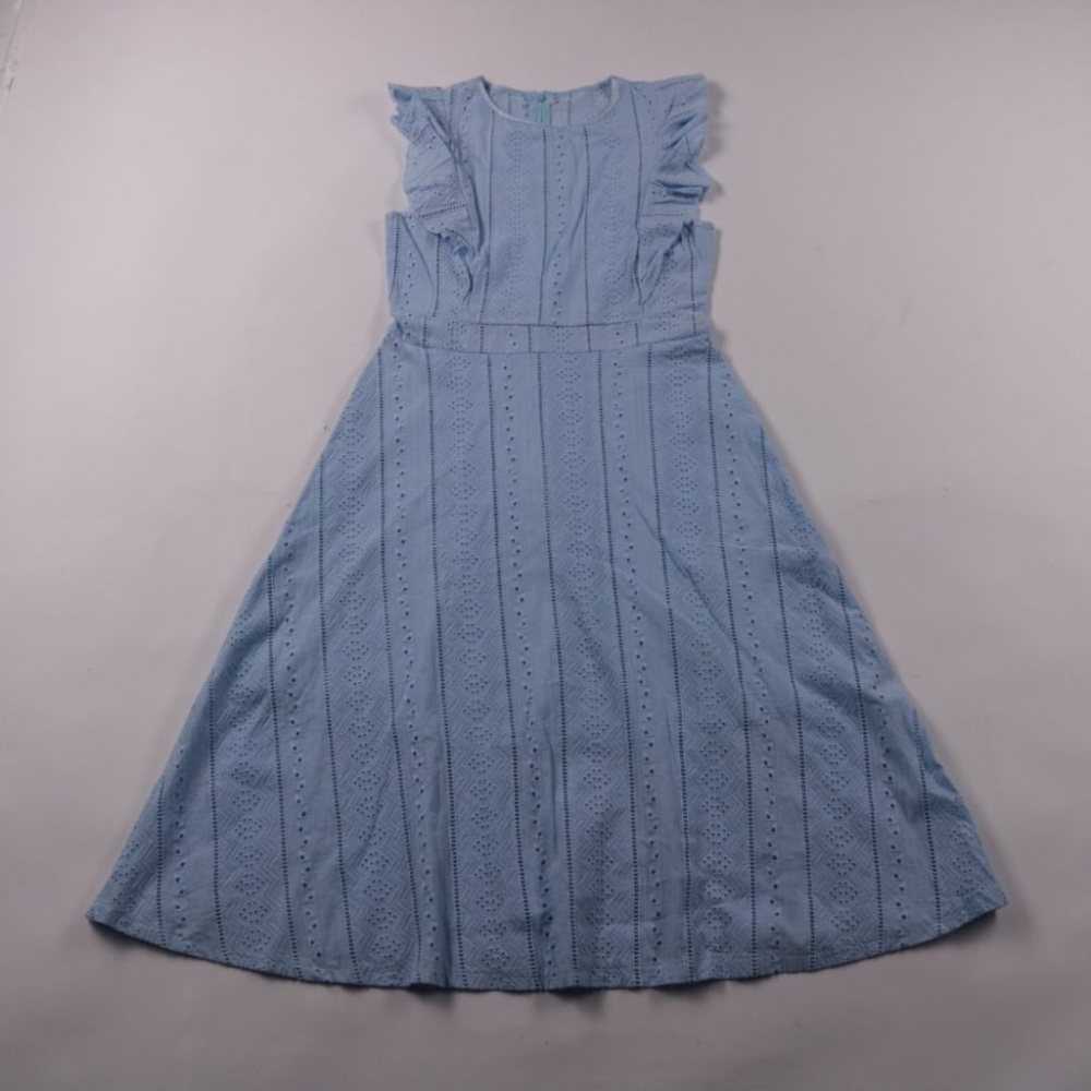 Летнее платье без бренда в голубом цвете, с ажурной фактурой и оборками на проймах. Подойдёт для прогулок и повседневных выходов в тёплую погоду. Лёгкий материал и застёжка-молния сзади делают его удобным в носке.