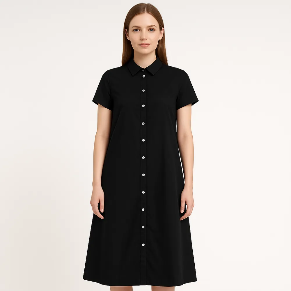 Повседневное платье-рубашка Primark чёрного цвета с коротким рукавом и застёжкой на пуговицы по всей длине. Подойдёт для офиса и на каждый день, легко сочетается с кедами или лоферами. Практичный плюс — удобная посадка и простота в уходе.