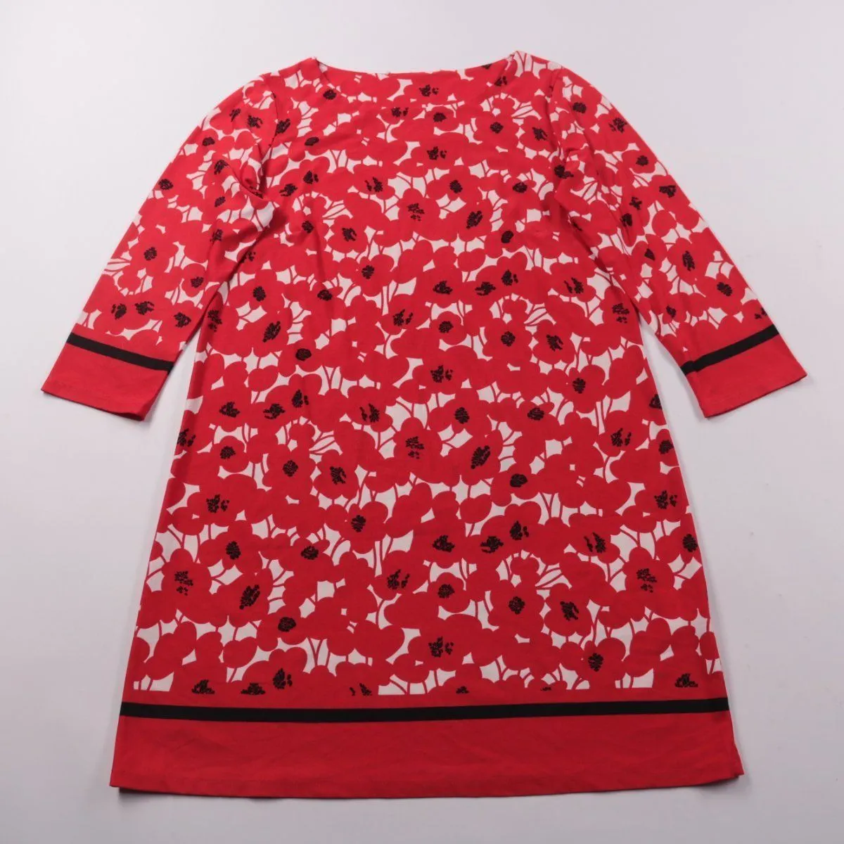 Женское повседневное платье прямого кроя с рукавом 3/4 и цветочным принтом на красном фоне. Подойдёт для офиса и прогулок в тёплую осень/весну или прохладное лето. Практичный плюс — немаркий рисунок и комфортная длина миди.