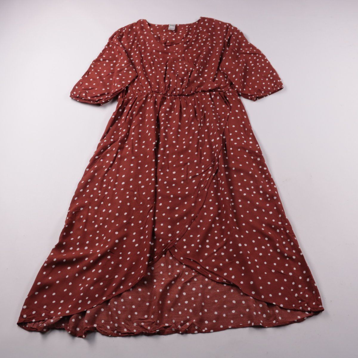 Повседневное платье Anko бордового цвета в белый горох, с V-образным вырезом и короткими рукавами. Подойдёт для прогулок и повседневных выходов в тёплую погоду благодаря лёгкой вискозной ткани. Преимущество — эластичная талия, которая комфортно садится по фигуре.