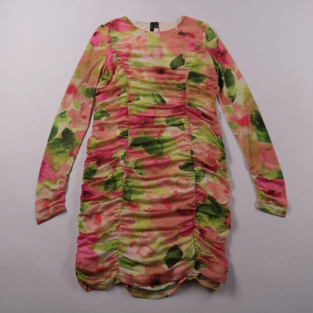 Платье Vero Moda из эластичного трикотажа с цветочным принтом и драпировкой по бокам, длина мини, длинный рукав. Подойдёт для прогулок и встреч, хорошо смотрится с кедами или ботильонами. Ткань тянется и комфортно садится по фигуре.