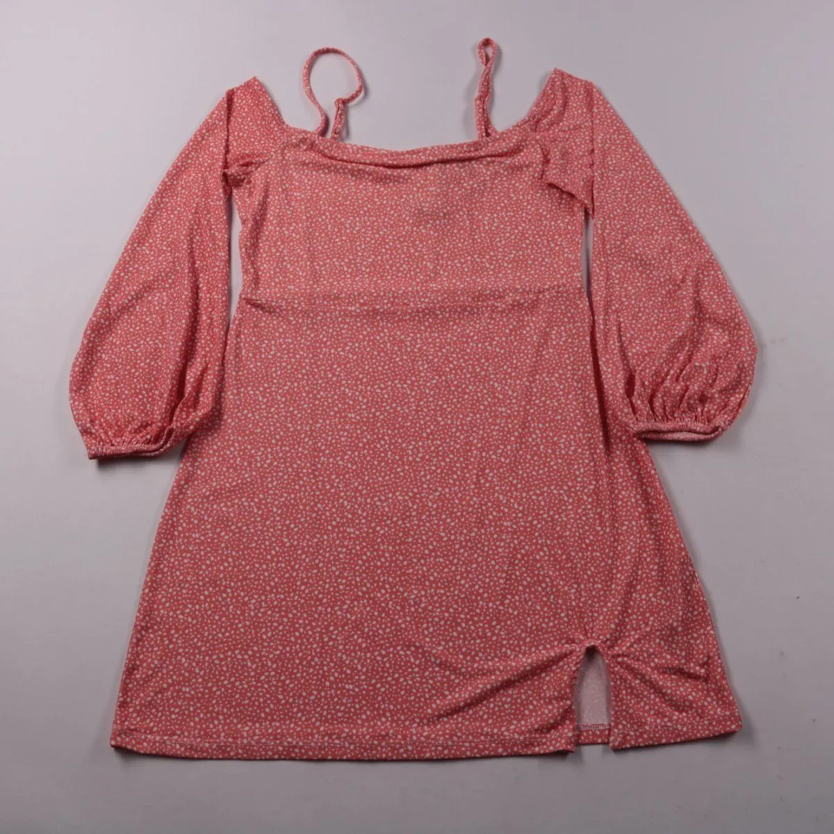 Повседневное платье NA-KD Reborn в розовом цвете с мелким белым принтом и квадратным вырезом, с длинными рукавами-фонариками и тонкими бретелями. Подойдёт для прогулок и встреч в тёплую погоду, хорошо смотрится с кедами или босоножками. Ткань тянется за счёт эластана и проста в уходе.
