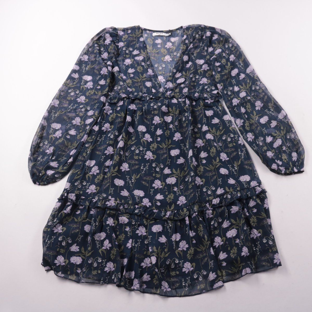 Повседневное платье NA-KD из лёгкой ткани с цветочным принтом, V-образным вырезом и длинными рукавами на манжете. Слегка завышенная линия талии и ярусный низ с воланом делают силуэт более воздушным. Практично тем, что полиэстер прост в уходе и быстро сохнет.