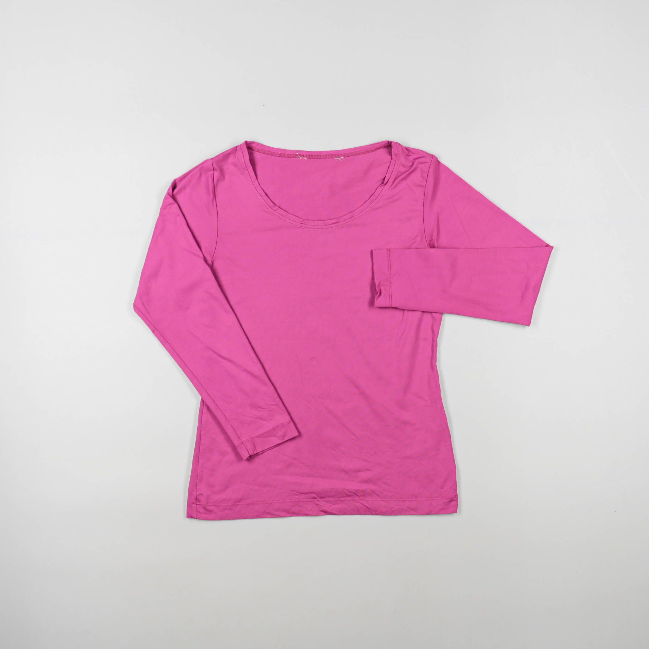 Женский лонгслив с круглым вырезом в ярком розовом цвете, без принта. Подойдёт для повседневной носки и как базовый слой под жакет или куртку в прохладную погоду. Мягкий трикотаж хорошо тянется и не стесняет движений.
