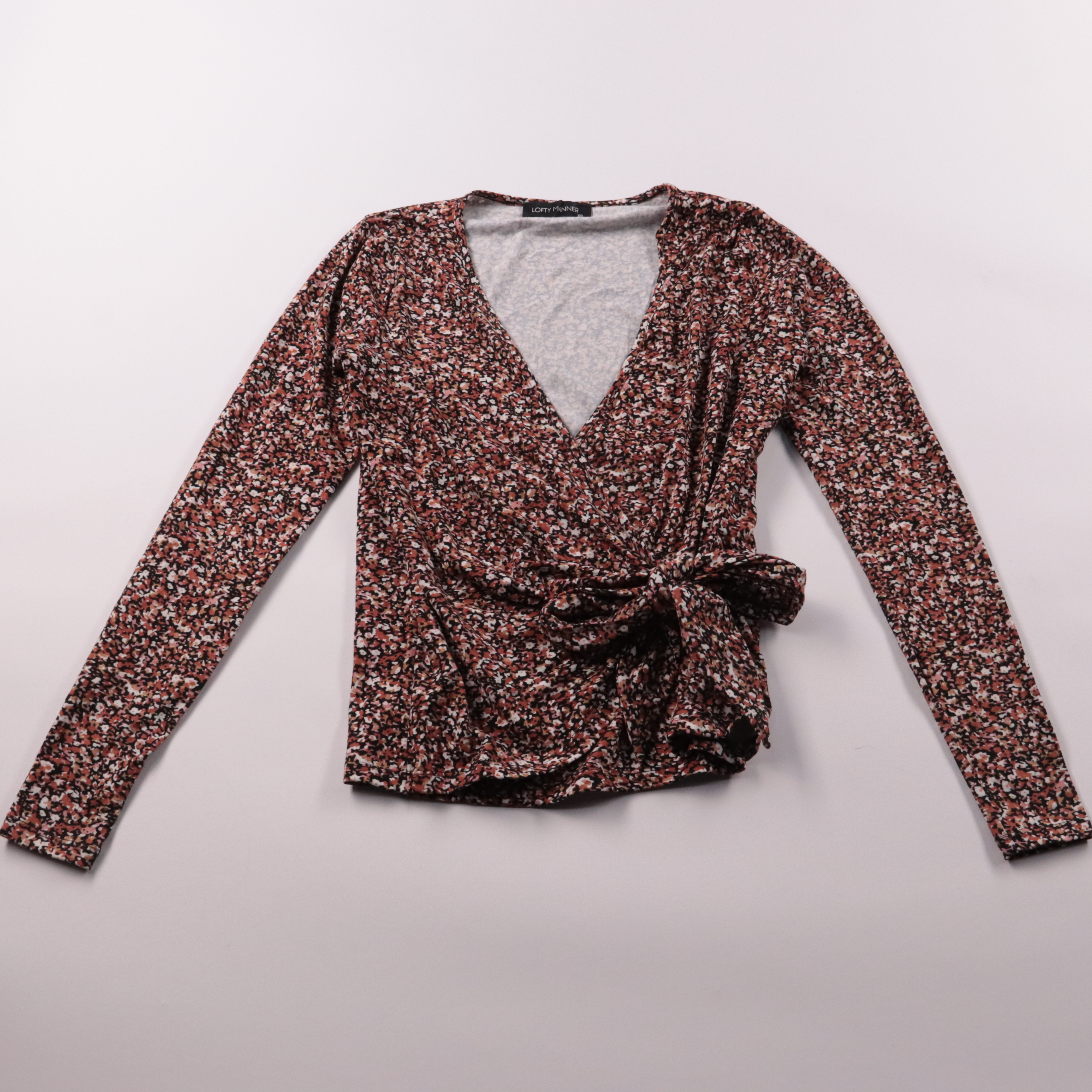 Блузка Lofty Manner с запахом, V-образным вырезом и длинным рукавом, с мелким цветочным принтом. Подойдёт для повседневных образов и офиса с жакетом, красиво подчёркивает талию за счёт пояса-банта. Тонкая ткань лёгкая и удобно комбинируется с джинсами ...