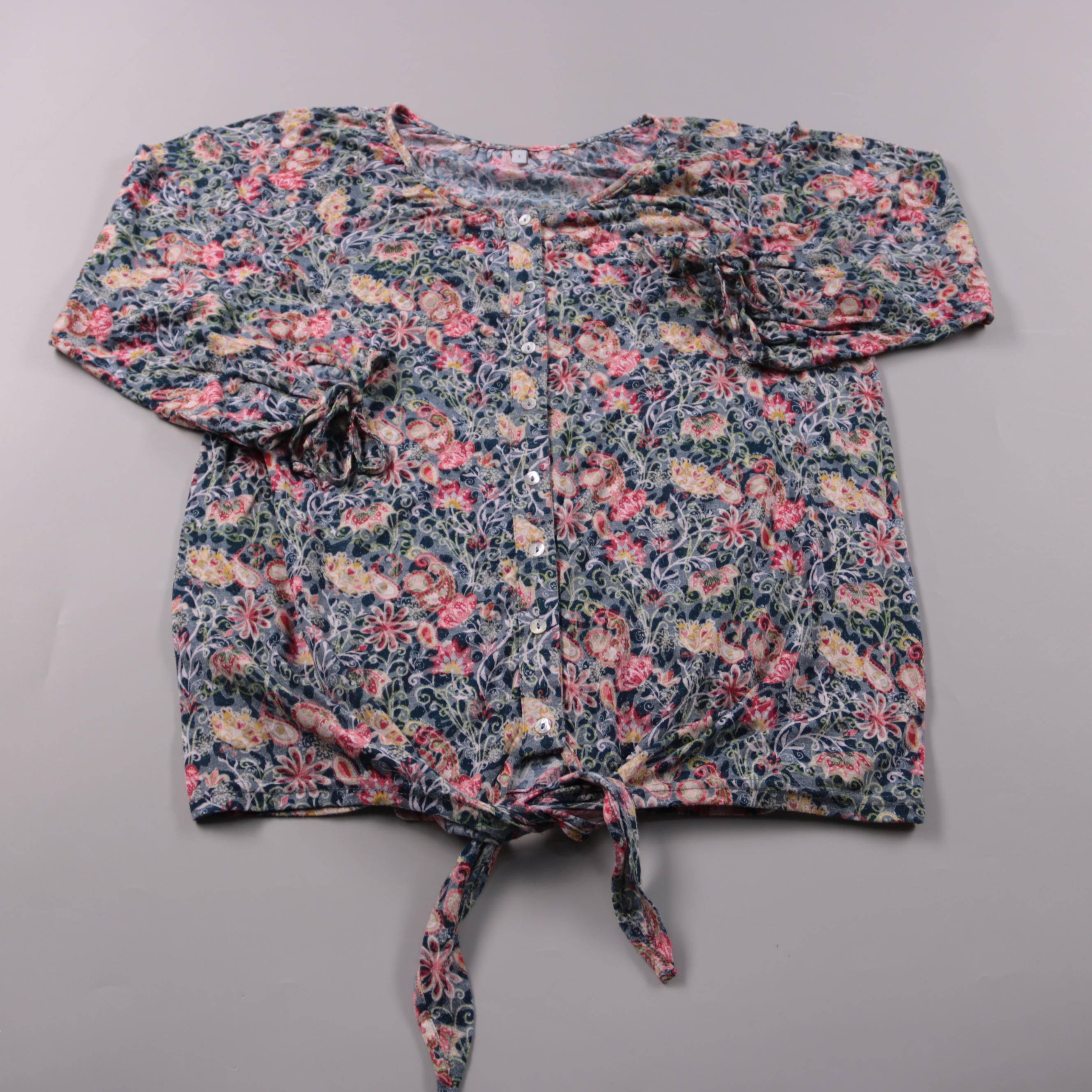 Женская блузка с цветочным принтом и завязкой спереди, застёгивается на пуговицы. Подойдёт для повседневных образов и прогулок в тёплую погоду, хорошо сочетается с джинсами и юбками. Лёгкая ткань и короткий рукав делают её комфортной в носке.