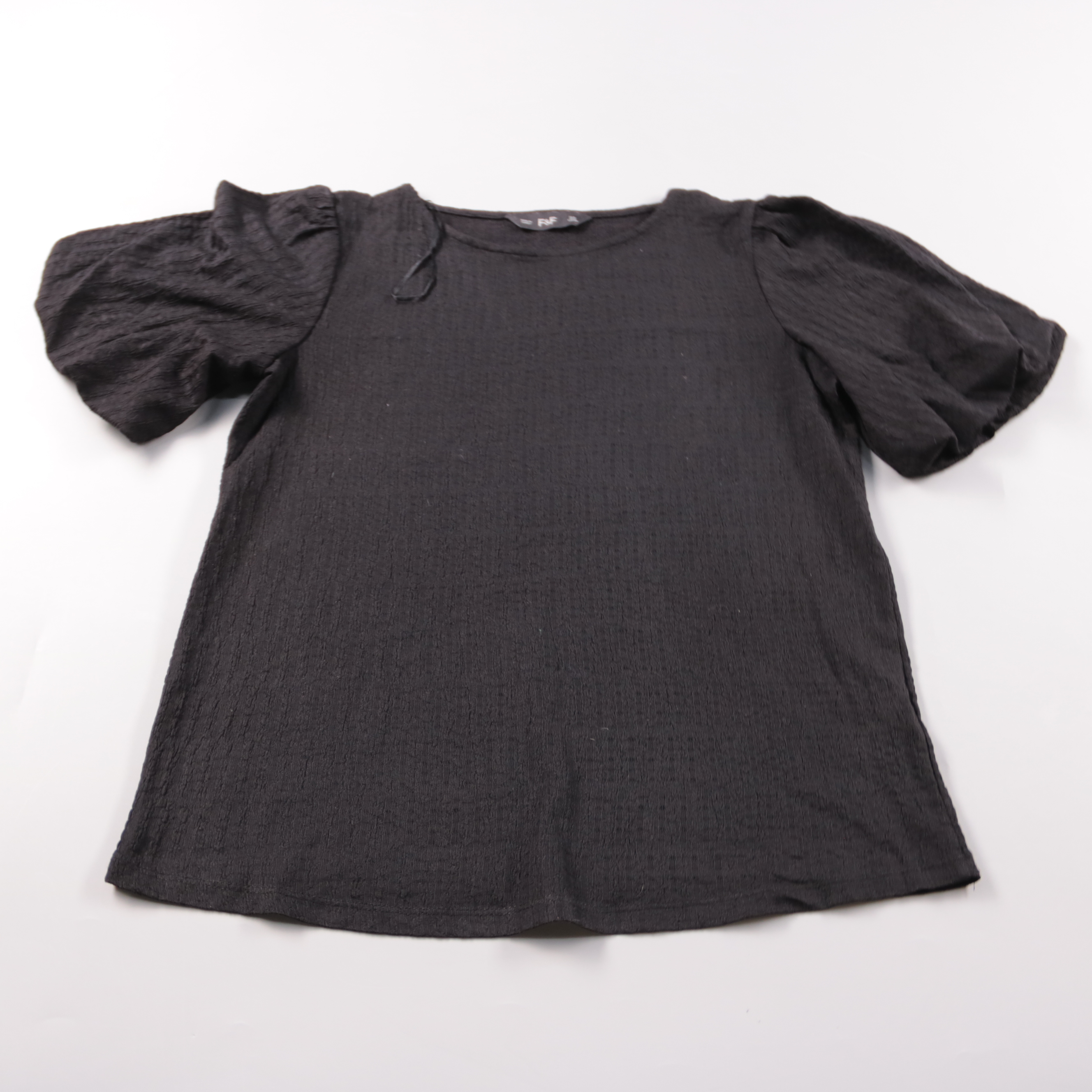 Женская блузка F&F чёрного цвета с объёмными рукавами-фонариками и фактурной тканью. Подойдёт для повседневных образов и на выход, легко сочетается с джинсами, юбкой или брюками. Материал практичный: быстро сохнет и почти не мнётся.