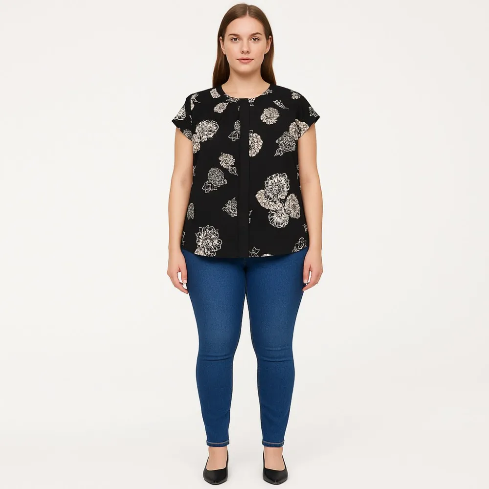 Блузка Peacocks из 100% полиэстера, чёрная с контрастным цветочным принтом. Подойдёт для офиса и повседневных образов с джинсами или юбкой благодаря свободному крою и короткому рукаву. Ткань почти не мнётся и быстро сохнет, удобна в уходе.