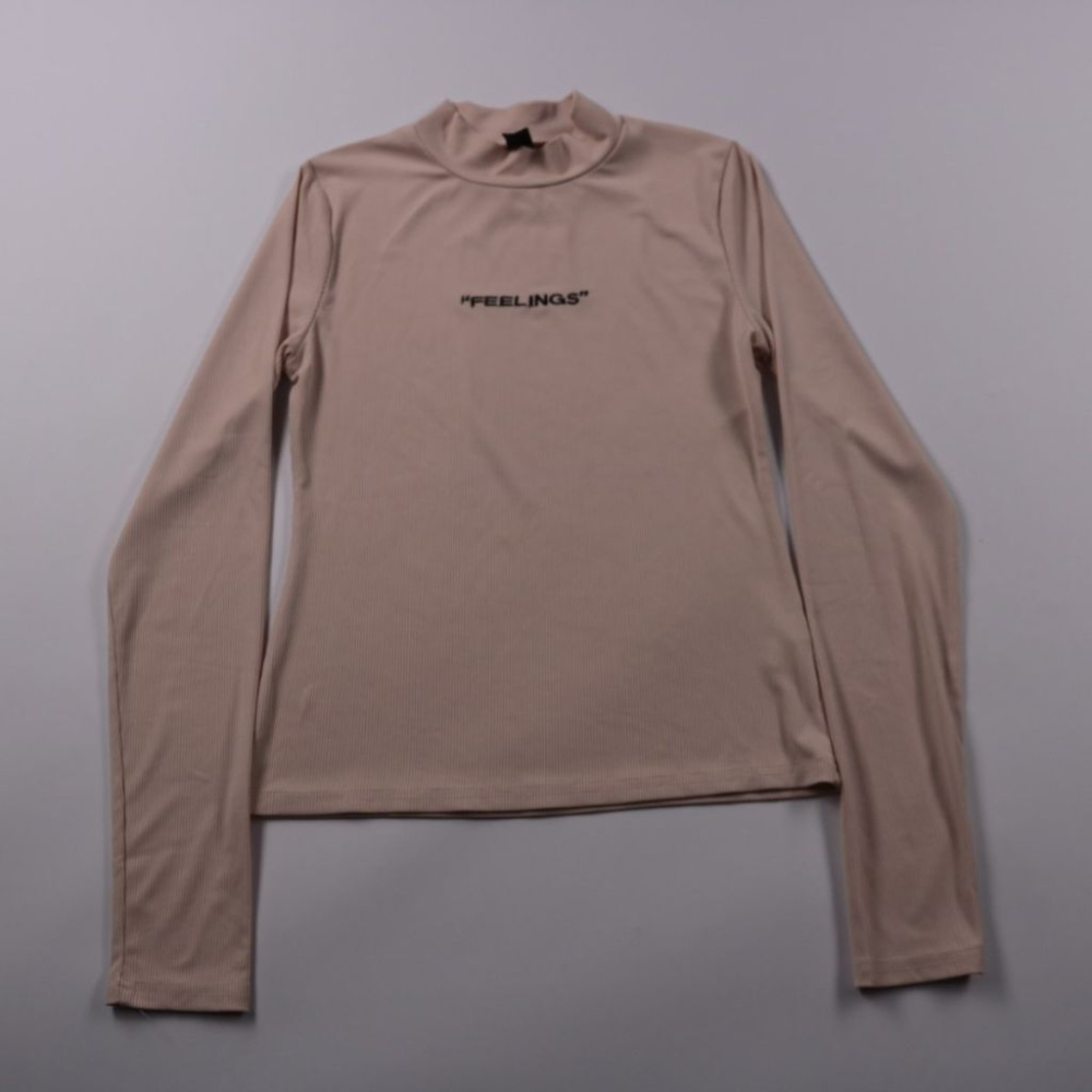 Женский лонгслив Shein бежевого цвета в рубчик, с небольшим воротником-стойкой и надписью “FEELINGS” на груди. Подойдёт для повседневных образов и как базовый слой в прохладную погоду. Ткань хорошо тянется и практически не мнётся, удобно сидит по фигуре.