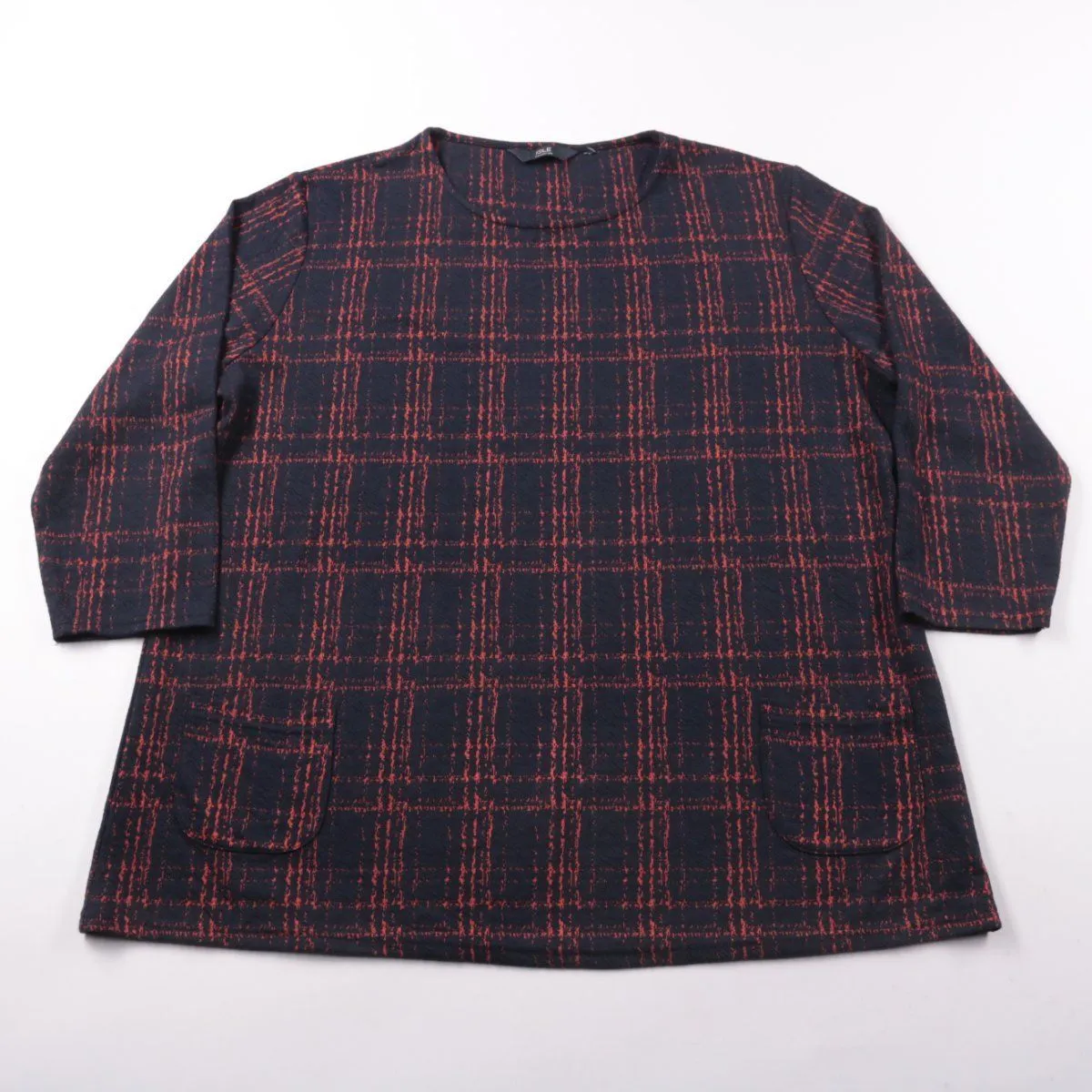 Женская блузка Isle Collection в тёмно-синем цвете с красной клеткой, прямого кроя и с длинным рукавом, есть накладные карманы спереди. Подойдёт для офиса и на каждый день, хорошо смотрится с брюками или джинсами. Практичный плюс — ткань с эластаном слегка тянется и комфортна в носке.