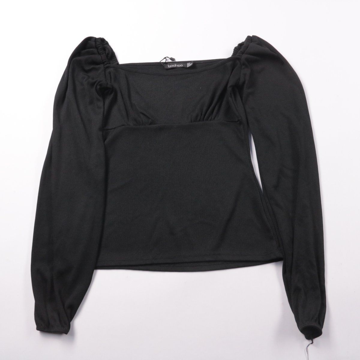 Чёрная блузка Boohoo из фактурного трикотажа в рубчик с квадратным вырезом и объёмными рукавами. Подойдёт для повседневных и вечерних образов с джинсами или юбкой. Тянущийся материал хорошо садится по фигуре и не сковывает движения.