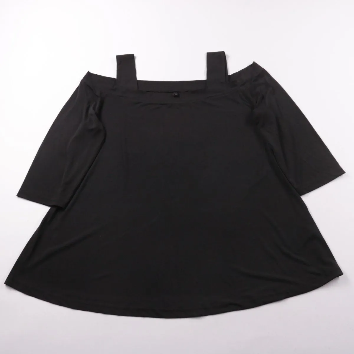 Чёрная блузка с открытыми плечами и коротким рукавом, без видимого бренда. Подойдёт для повседневных образов и выходов, хорошо сочетается с юбками и брюками. Эластичный материал тянется и комфортно садится по фигуре.