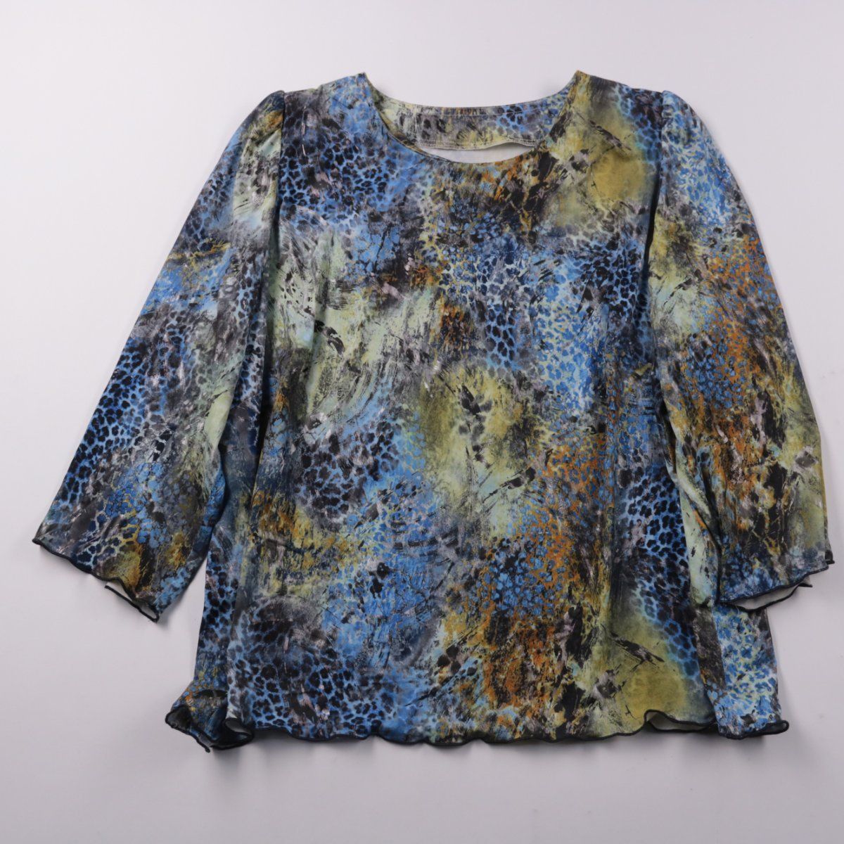 Женская блузка с абстрактным разноцветным принтом в сине-зелёной гамме и длинными рукавами. Подойдёт для повседневных образов и офиса, хорошо сочетается с однотонными брюками или юбкой. Лёгкая ткань и свободный крой обеспечивают комфорт в течение дня.