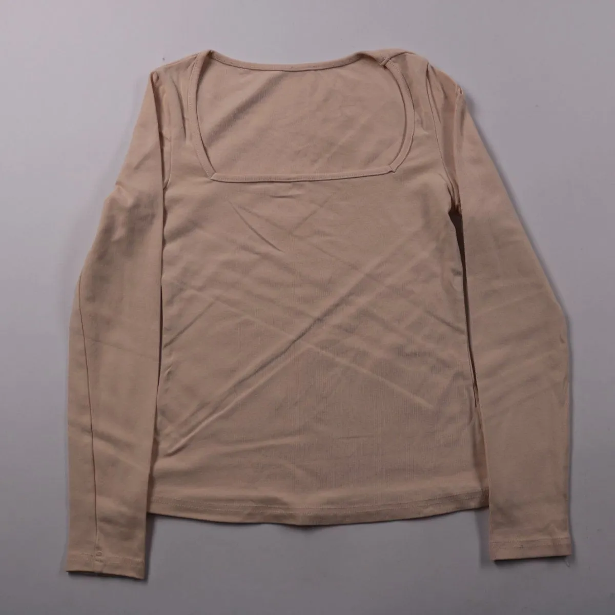 Базовая женская блузка (лонгслив) в бежевом цвете с квадратным вырезом и длинным рукавом. Подойдёт для повседневных образов и как нижний слой под жакет или кардиган. Тонкий трикотаж комфортно сидит и не занимает много места в гардеробе.