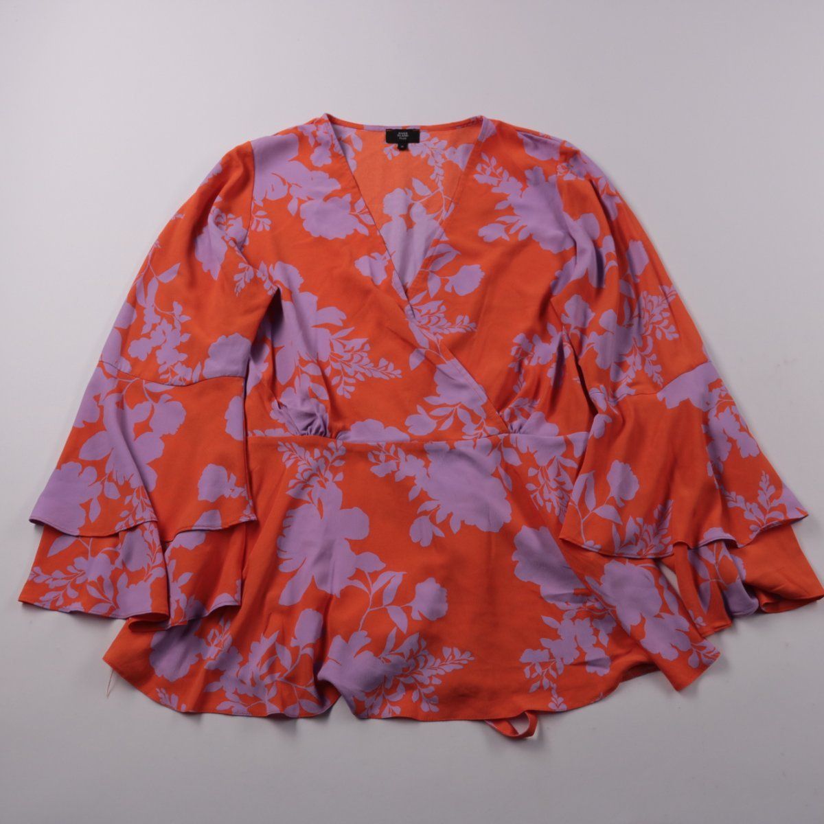 Блузка River Island Plus с запахом и цветочным принтом в красно-фиолетовых тонах, с поясом на талии и рукавами 3/4 с воланами. Подойдёт для лета и тёплой весны, на прогулки или выход в кафе. Лёгкая ткань и регулируемая посадка на талии делают её удобной в носке.