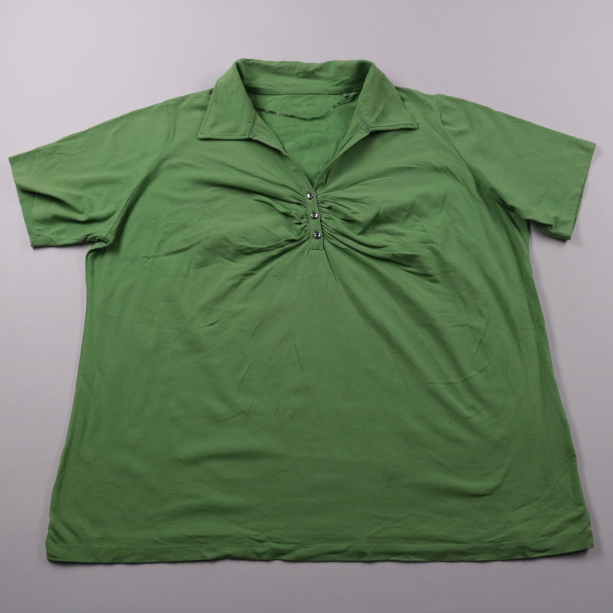 Зелёная блузка Yessica с коротким рукавом и V-образным вырезом на пуговицах, с декоративной сборкой спереди. Подойдёт для повседневных образов и офиса в тёплое время года или под жакет в межсезонье. Трикотаж с эластаном хорошо тянется и комфортно садится по фигуре.