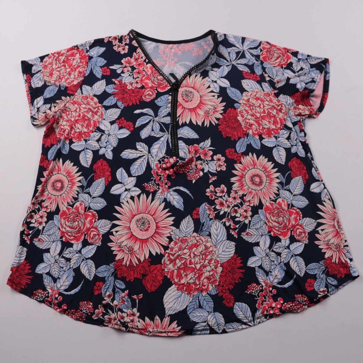 Женская блузка с ярким цветочным принтом и V-образным вырезом, подойдёт для повседневных летних образов и отдыха. Короткий рукав и свободный крой не сковывают движения и хорошо смотрятся с джинсами или юбкой. Ткань с эластаном тянется и комфортно садится по фигуре.