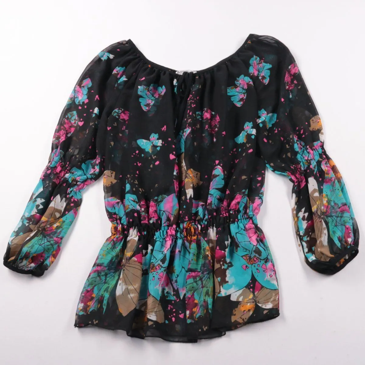 Блузка Ively-T из лёгкой полупрозрачной ткани с ярким цветочным принтом, с кулиской по талии. Подойдёт для повседневных образов и выходов в тёплое время года, хорошо сочетается с джинсами или юбкой. Тонкий материал быстро сохнет и почти не занимает места в сумке.