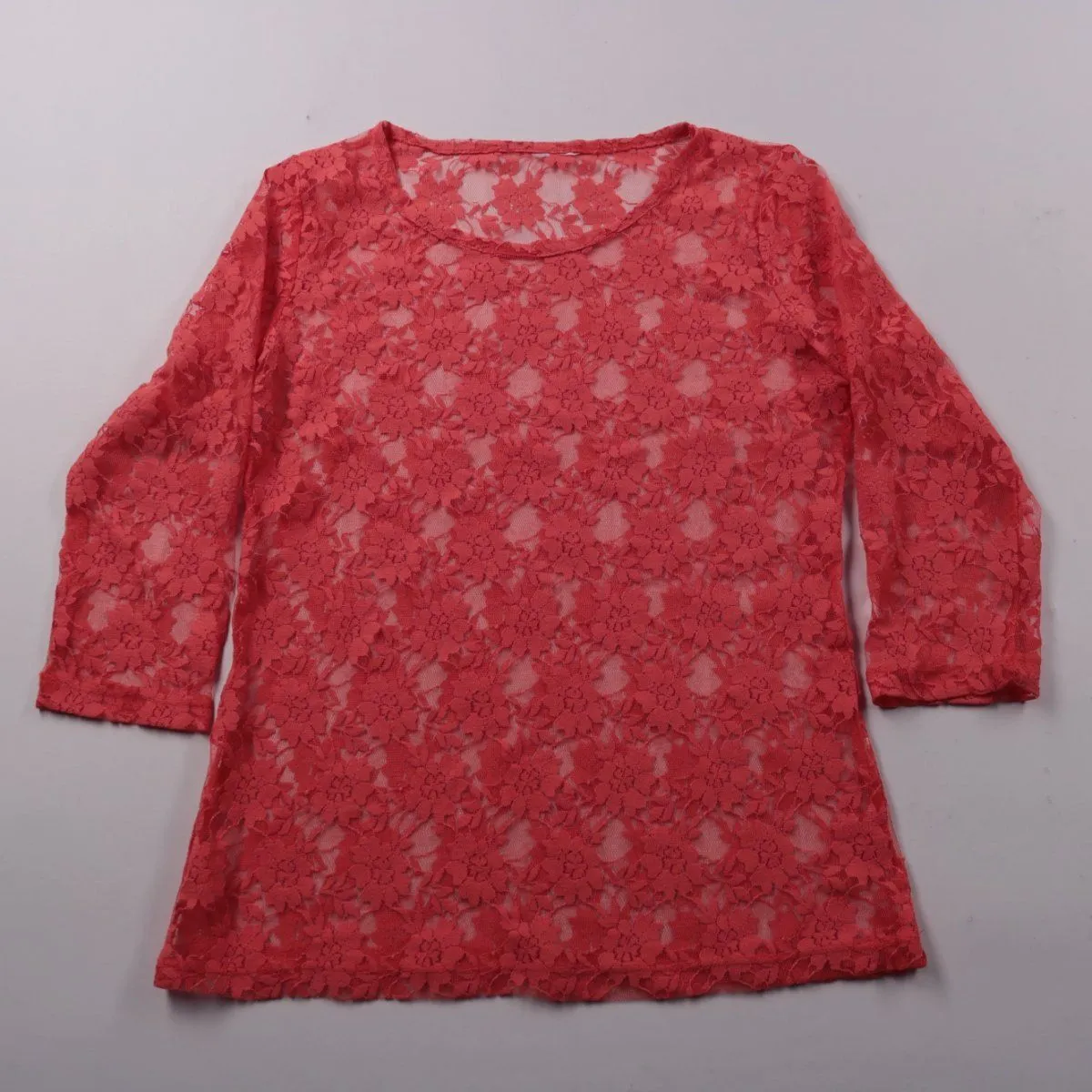 Кружевная женская блузка красного (кораллового) оттенка с длинными рукавами и полупрозрачной фактурой. Подойдёт для летних образов и для выхода, лучше носить с топом или бра. Лёгкий материал почти не занимает места и удобно брать с собой.