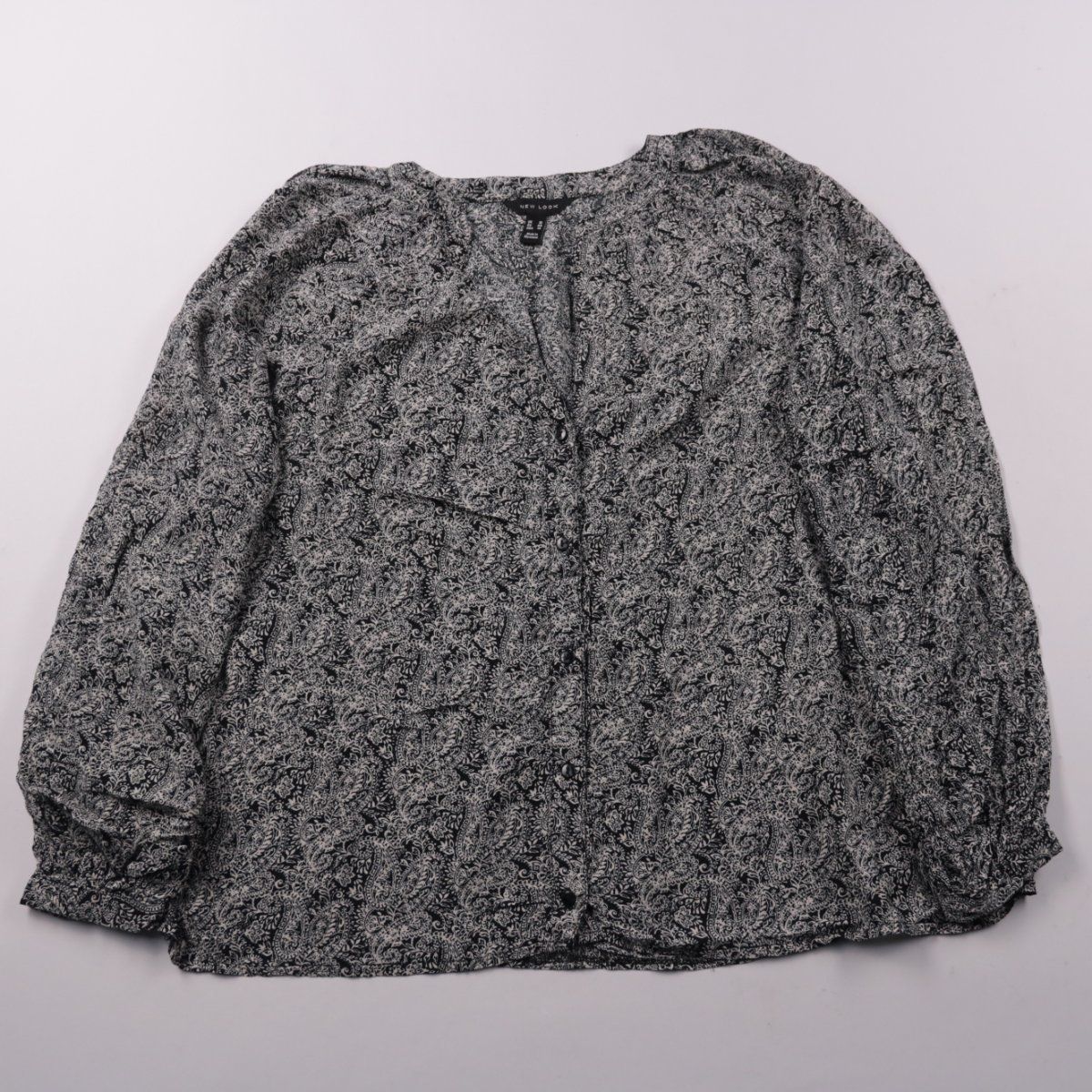 Блузка New Look с чёрно-белым узором пейсли и V‑образным вырезом. Подойдёт для офиса и повседневных образов, хорошо сочетается с однотонными брюками или джинсами. Лёгкая вискоза комфортна в течение дня и легко драпируется.