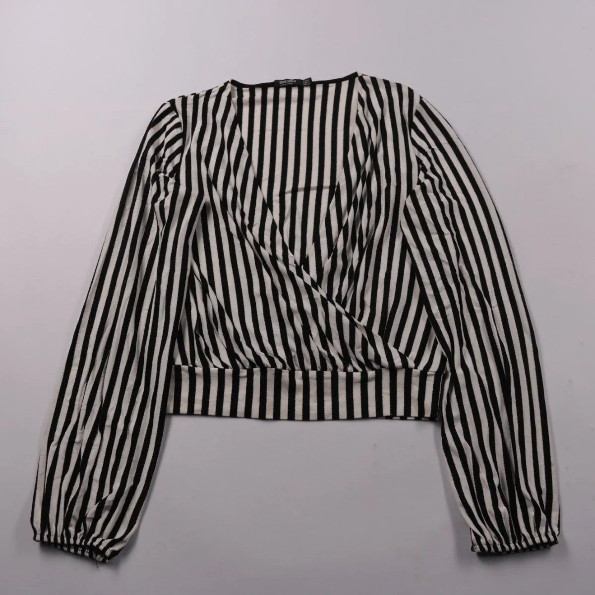 Женская блузка Bershka в чёрно-белую вертикальную полоску с запахом и длинным рукавом. Подойдёт для повседневных образов и для офиса с однотонными брюками или юбкой. Эластичная ткань хорошо тянется и комфортно садится по фигуре.