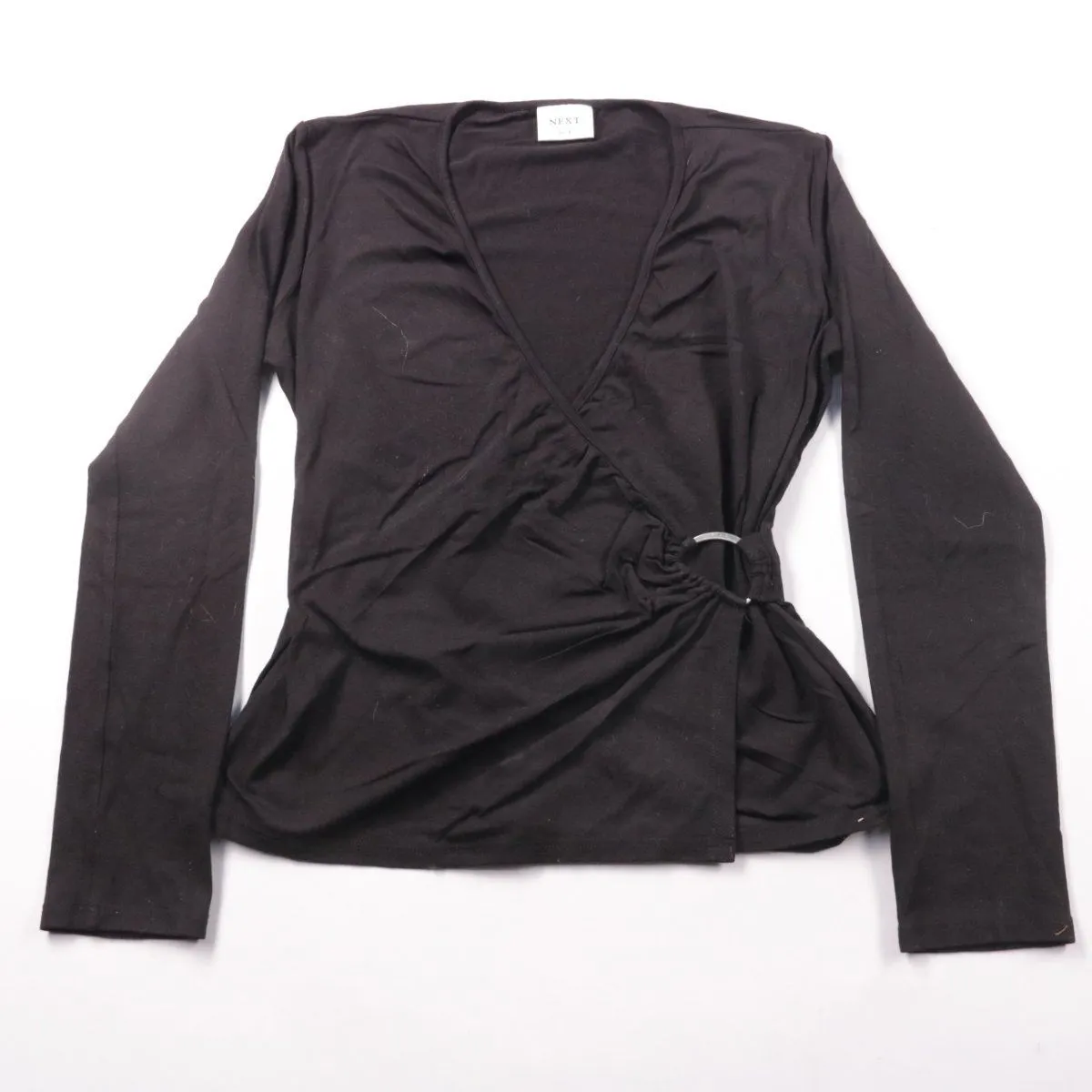 Чёрная блузка Next на запах с V-образным вырезом и декоративным кольцом сбоку. Подойдёт для офиса и на каждый день, хорошо сочетается с брюками и юбками. Эластичная ткань комфортно садится по фигуре и не сковывает движения.