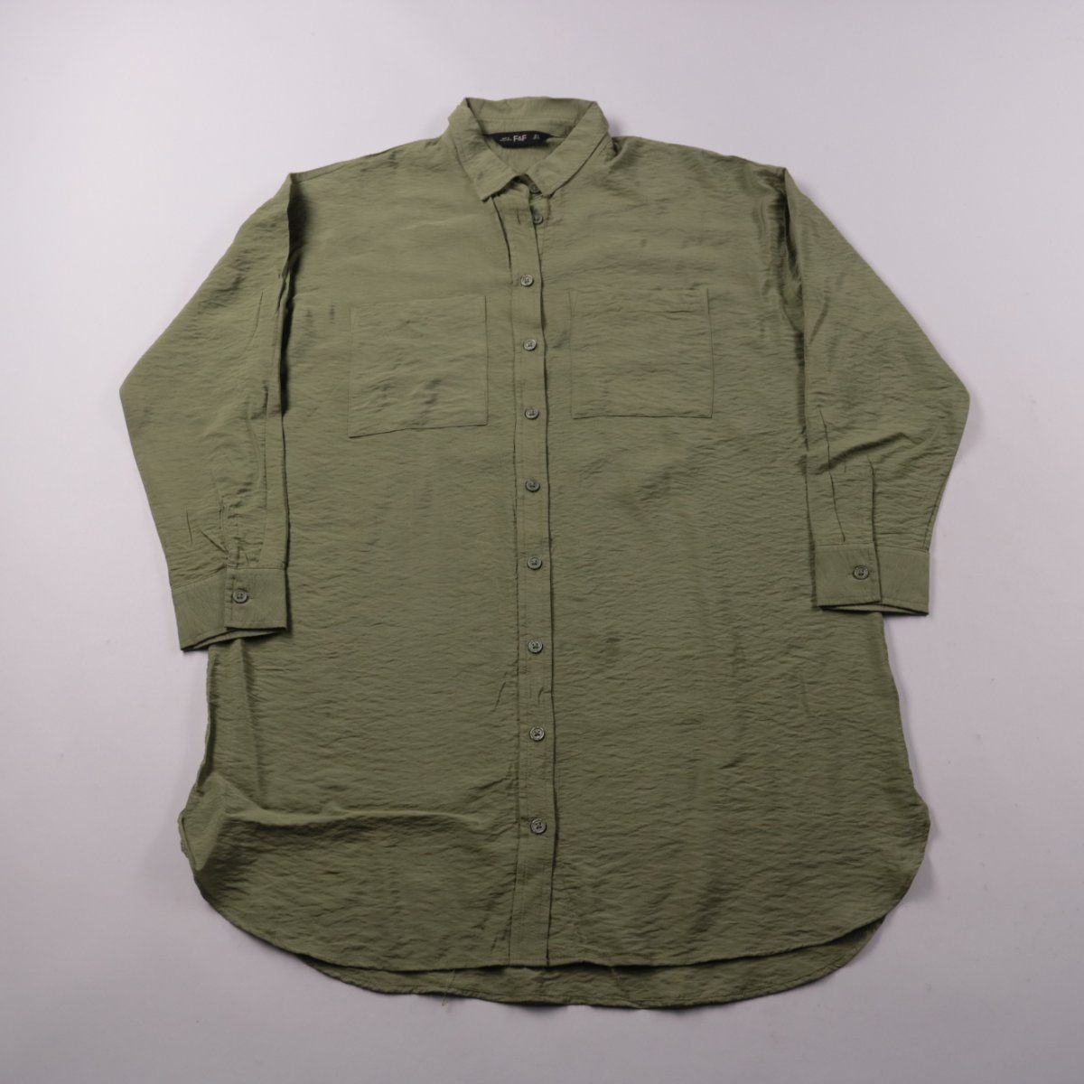 Женская рубашка F&F цвета хаки с длинным рукавом и застёжкой на пуговицы, с накладными карманами на груди. Подойдёт для повседневных образов и офиса, удобно носить как самостоятельный верх или как лёгкий слой поверх топа. Практичный плюс — функциональные карманы и удлинённый крой, который хорошо сочетается с джинсами и брюками.