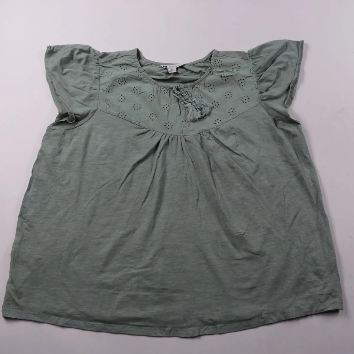 Блузка Rockmans оливково-зелёного цвета с вышивкой на кокетке и рукавами-крылышками. Подойдёт для тёплой погоды и повседневных образов, хорошо смотрится с джинсами или шортами. Хлопковая ткань мягкая и дышащая.