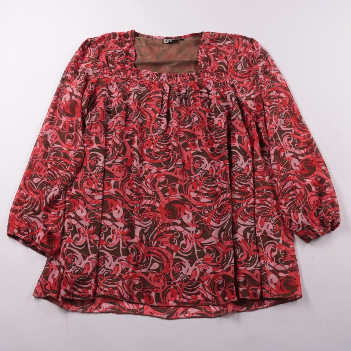 Женская блузка HL из лёгкого полиэстера с ярким красно-коричневым принтом и квадратным вырезом. Свободный крой подойдёт для повседневных образов и офиса в сочетании с брюками или юбкой. Материал почти не мнётся и быстро сохнет.
