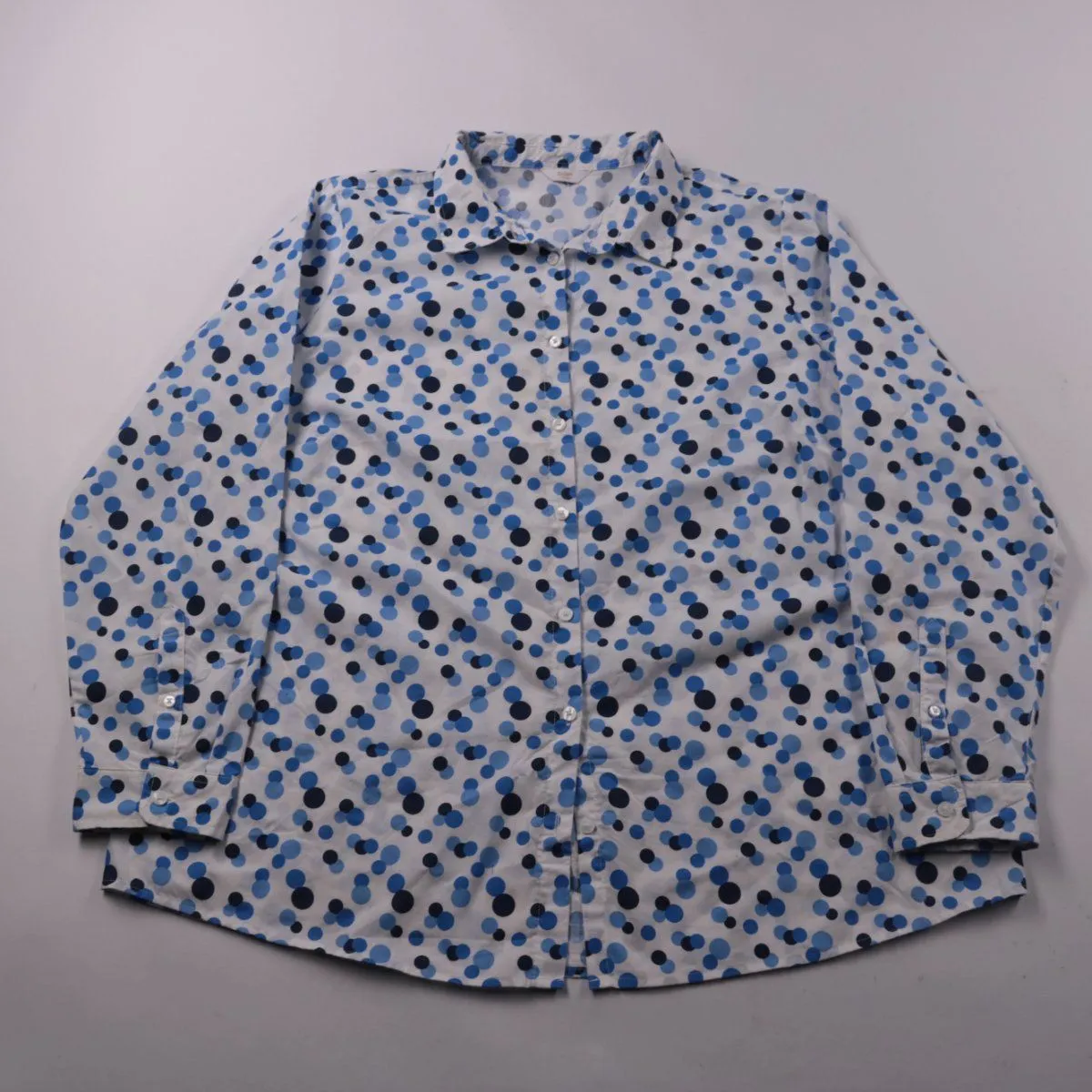 Женская рубашка с длинным рукавом и отложным воротником, принт в горох. Подойдёт для повседневных и офисных образов, хорошо смотрится с джинсами и однотонными брюками. Смесовый состав хлопок/полиэстер легче гладится и быстрее сохнет.