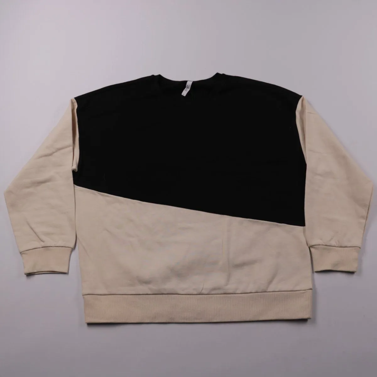 Свитшот Only в стиле колор-блок (чёрный верх и бежевый низ), без капюшона, с круглым вырезом. Подойдёт для повседневных образов в демисезон и прохладные летние вечера. Практичен тем, что хлопковая ткань комфортна и легко сочетается с базовыми вещами.