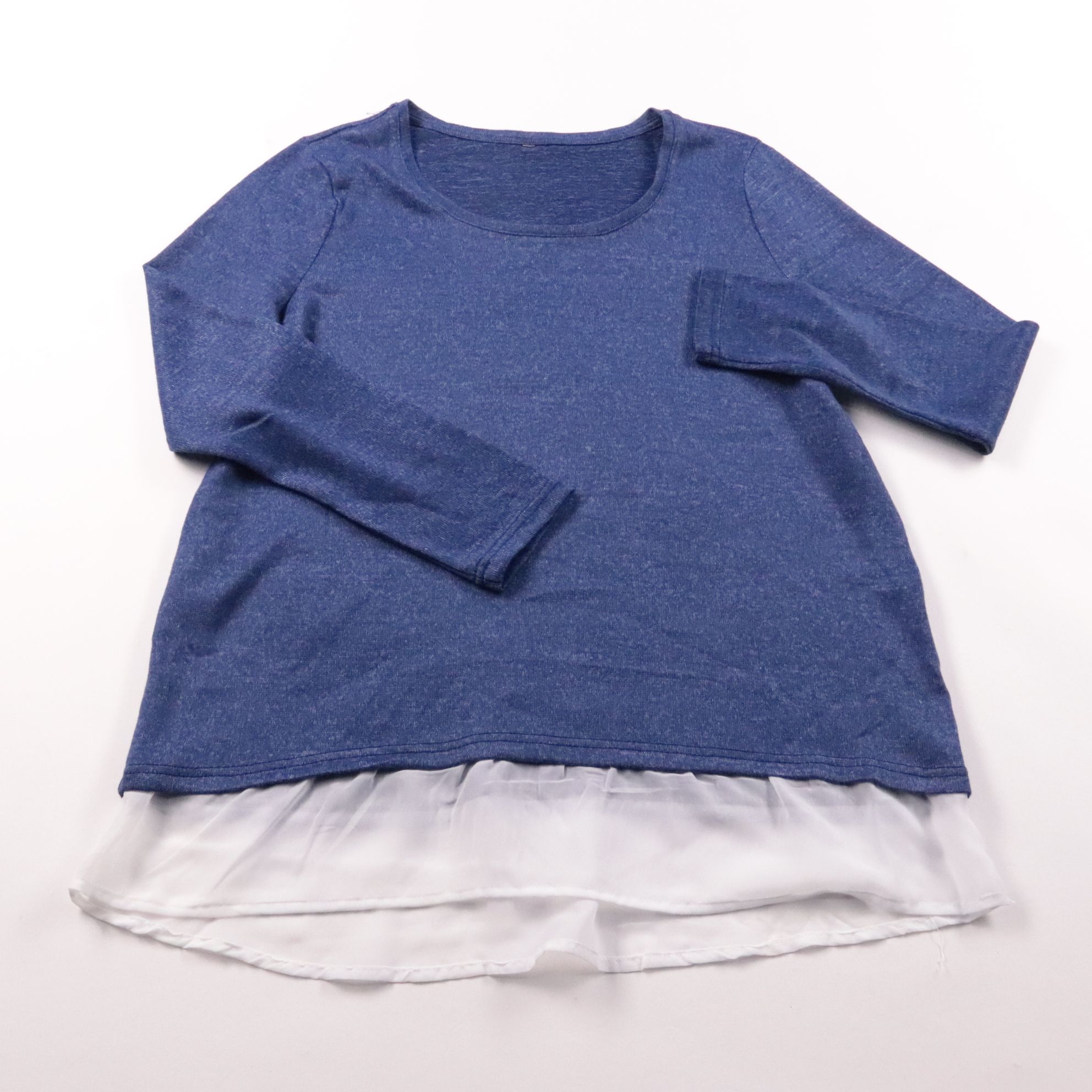 Синий женский лонгслив с круглым вырезом и декоративным белым нижним слоем по низу. Подойдёт для повседневных образов с джинсами или брюками в прохладную погоду. Мягкий трикотаж комфортно носится и не стесняет движений.