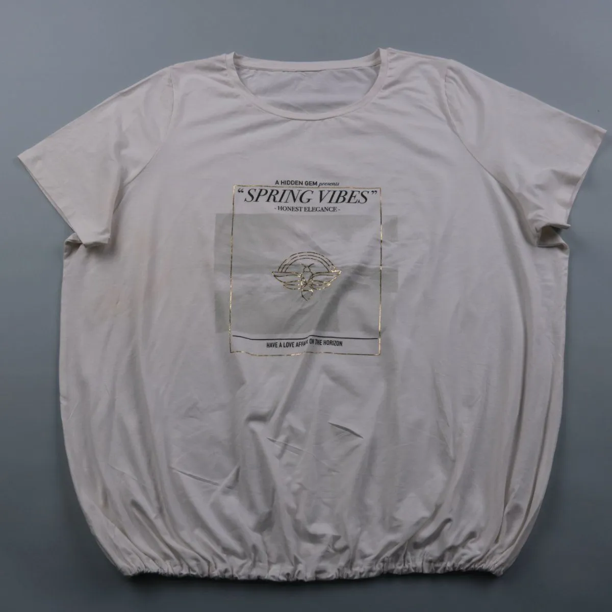 Женская футболка светло-серого (почти белого) цвета с принтом «SPRING VIBES» и эластичной сборкой по низу. Подойдёт для повседневных образов в тёплую погоду, с джинсами или юбкой. Эластичный низ помогает посадке и не задирается при движении.