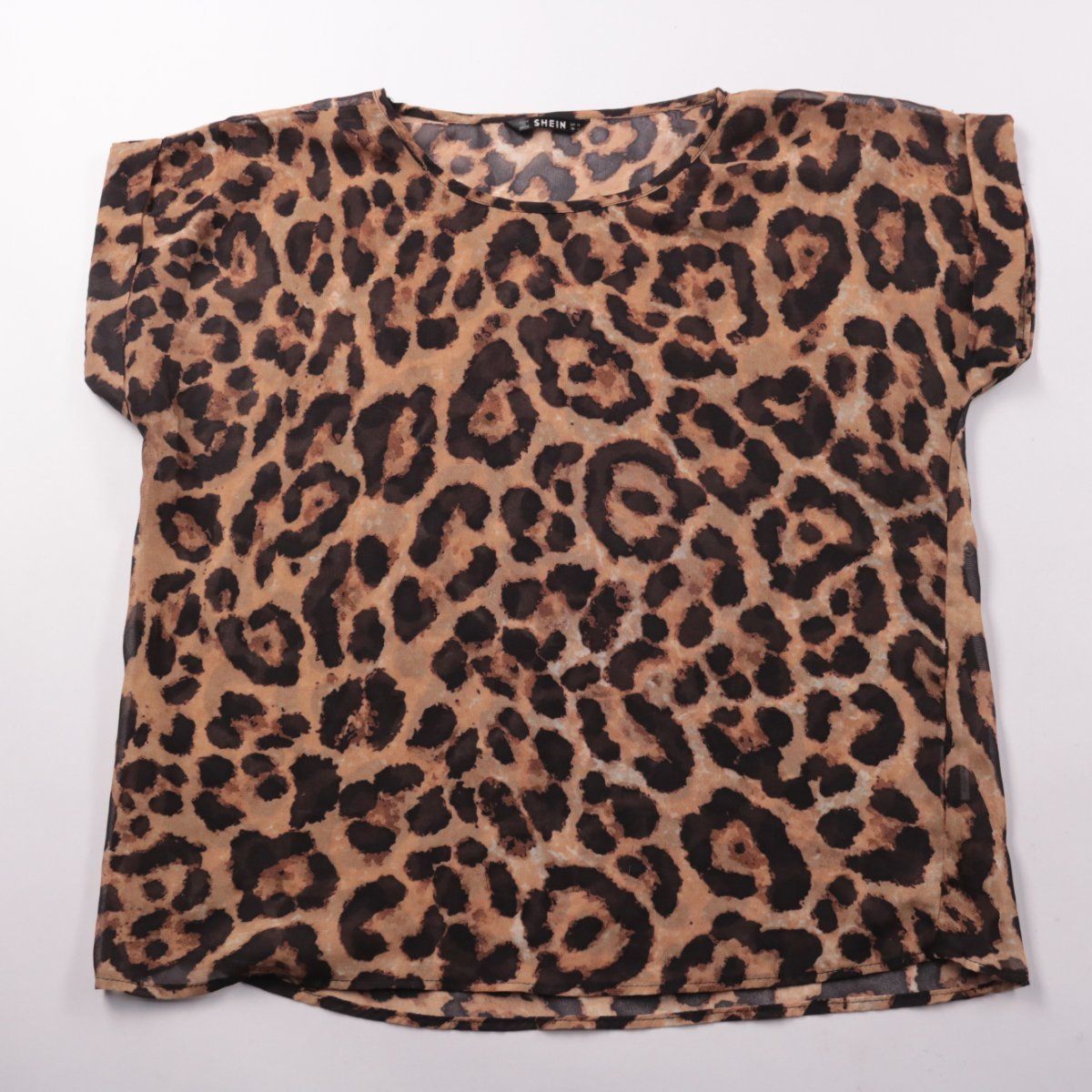 Женская футболка SHEIN с леопардовым принтом и круглым вырезом. Подойдёт для летних повседневных образов и отдыха, хорошо сочетается с джинсами и однотонными юбками. Лёгкая синтетическая ткань быстро сохнет и почти не мнётся.
