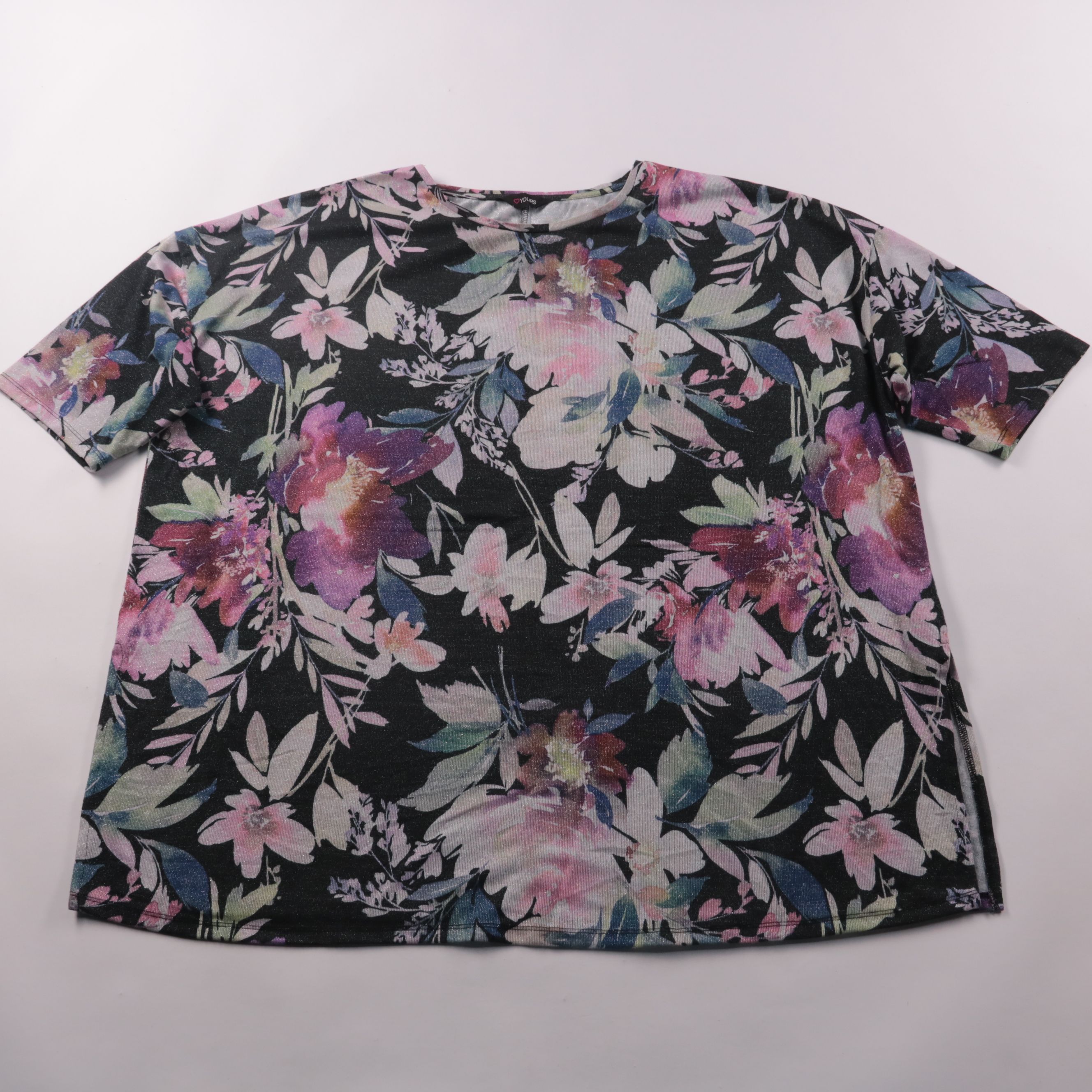 Женская футболка Yours с цветочным принтом на тёмной основе и коротким рукавом. Подойдёт для повседневных образов, отдыха и прогулок, хорошо смотрится с джинсами и однотонными брюками. Материал эластичный, поэтому изделие комфортно сидит и не сковывает...
