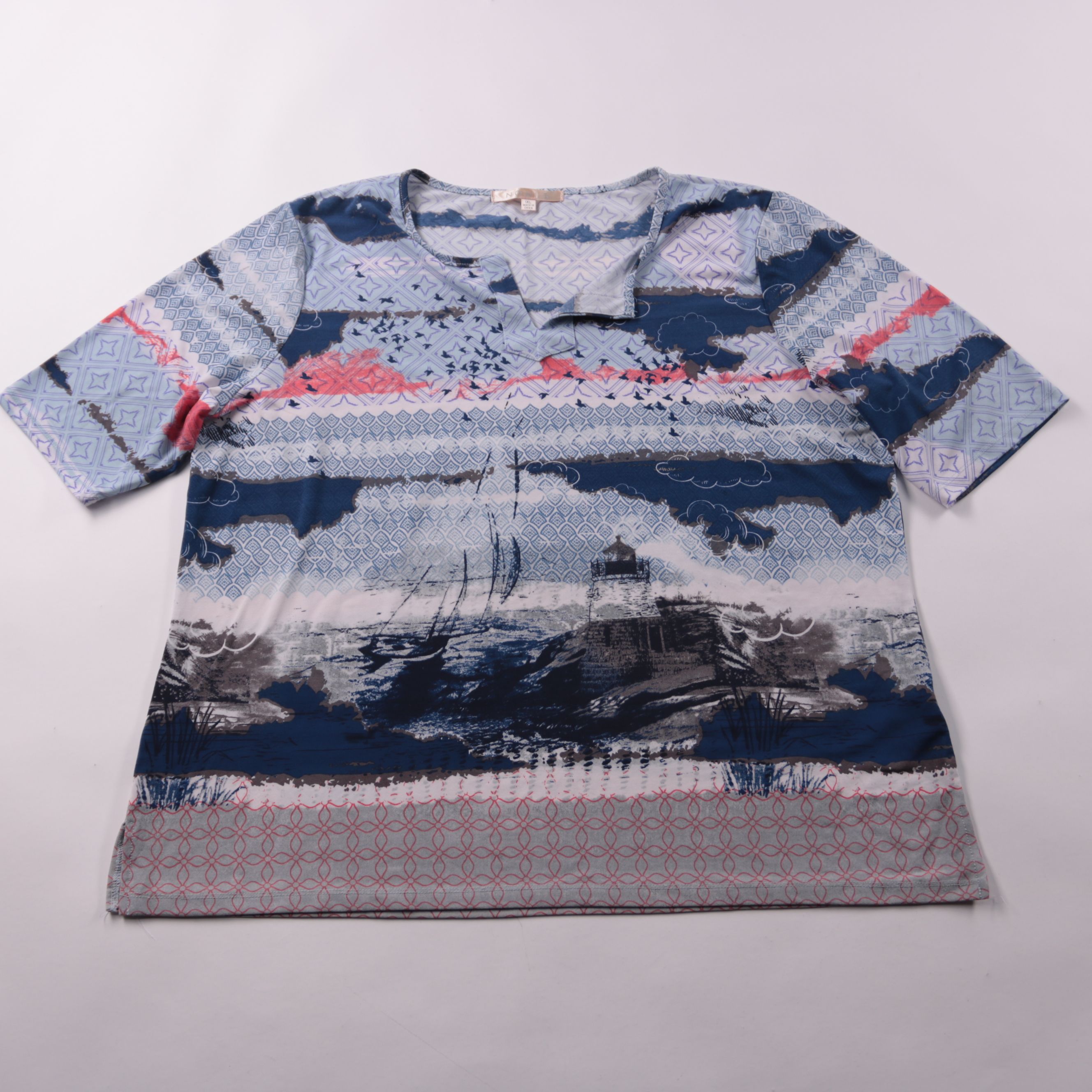 Женская футболка Noni B с V-образным вырезом и коротким рукавом, с ярким принтом в морской тематике. Подойдёт для повседневных летних образов и отдыха. Ткань тянется и практически не мнётся, удобна в уходе.