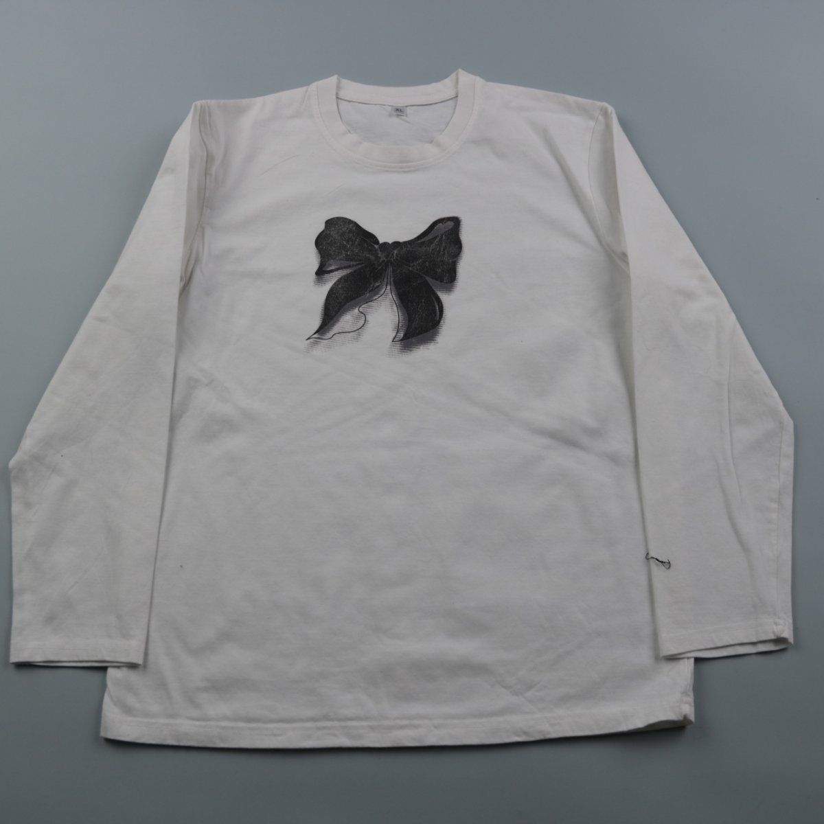 Женский лонгслив (бренд не указан) белого цвета с принтом в виде чёрного банта на груди. Подойдёт для повседневной носки и как базовый слой под жакет или кардиган. Хлопковая ткань приятна к телу и хорошо пропускает воздух.