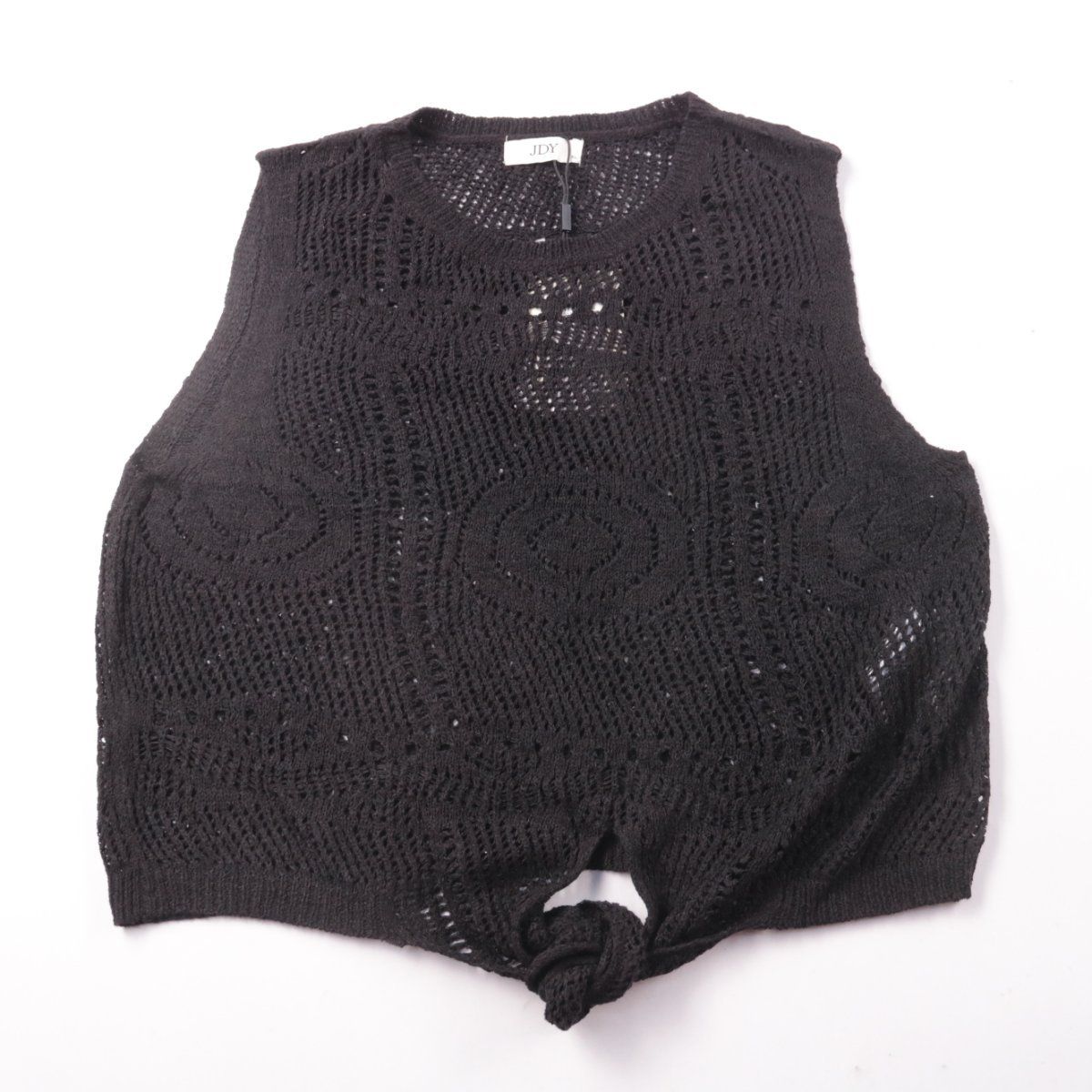 Вязаный топ JDY чёрного цвета с ажурным узором и круглым вырезом. Модель без рукавов, снизу завязывается узлом — удобно для летних образов и наслоения поверх бра. Лёгкая вязка хорошо пропускает воздух.