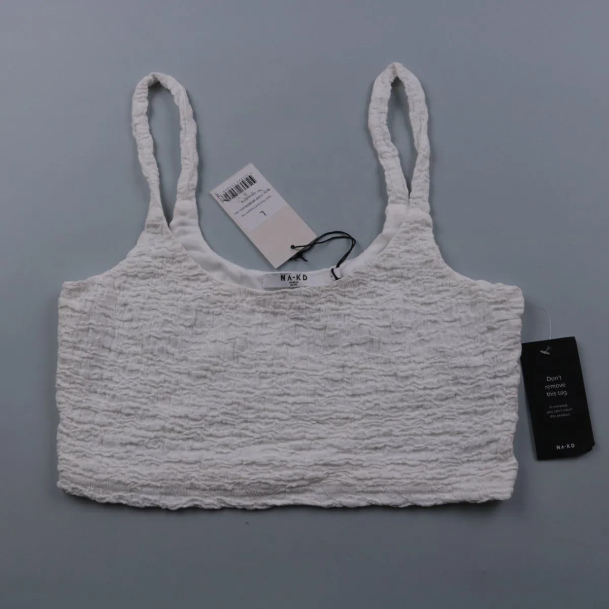 Женский укороченный топ NA-KD белого цвета с фактурной жатой/крэш-текстурой и широкими бретелями. Подойдёт для летних образов, отдыха и как базовый верх под жакет или рубашку. Эластичная ткань хорошо садится по фигуре и не стесняет движений.