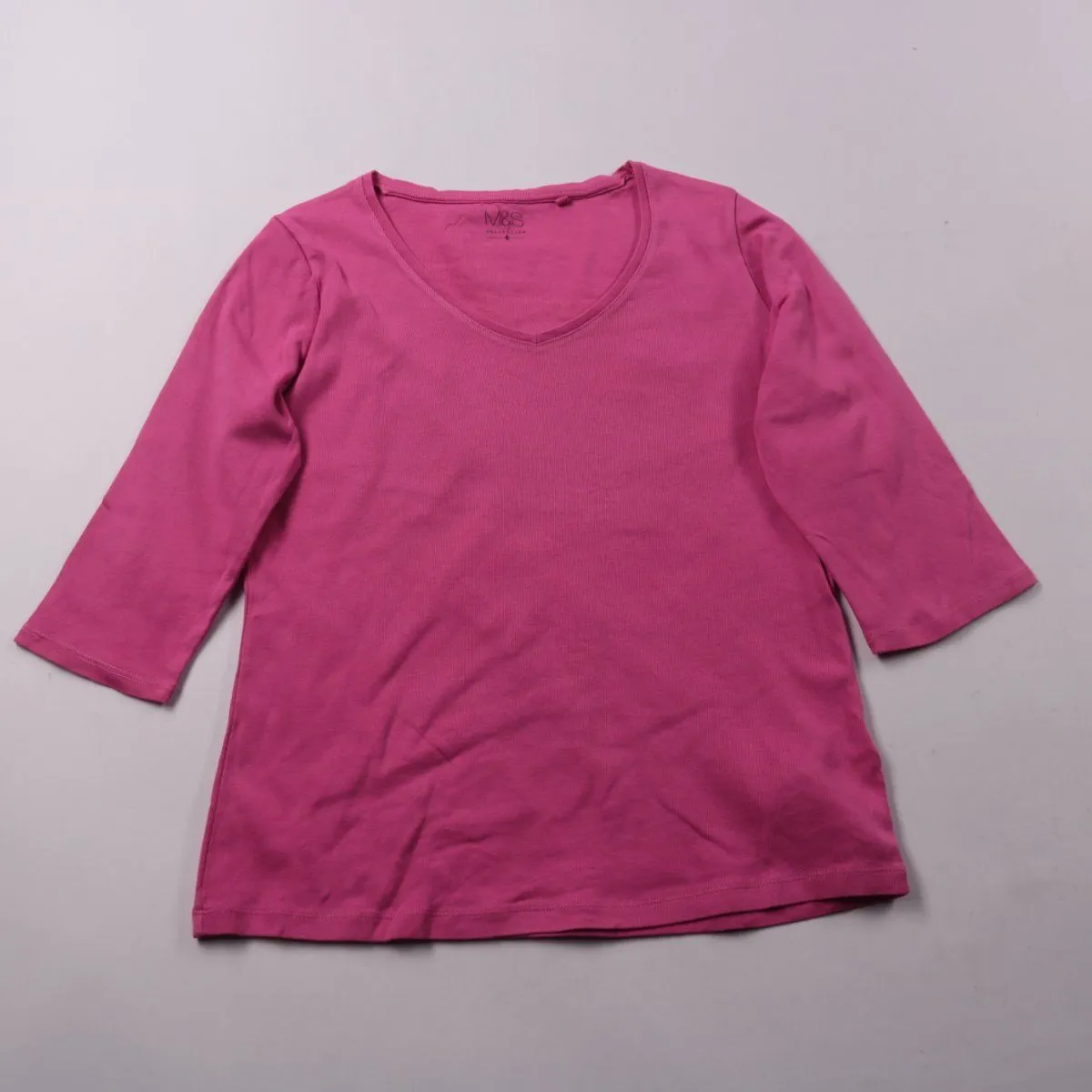 Женский лонгслив M&S Collection ярко-розового цвета с V-образным вырезом и рукавом 3/4. Подойдёт для повседневной носки и как базовый слой под жакет или кардиган. Натуральный хлопок хорошо дышит и приятен к телу.