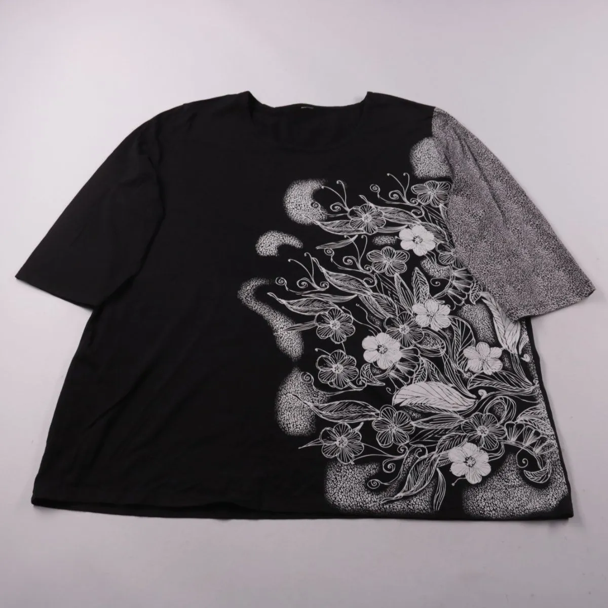 Женская чёрная футболка с контрастным белым цветочным принтом и коротким рукавом. Подойдёт для повседневных образов и сочетаний с джинсами или однотонными брюками. Натуральный хлопок хорошо дышит и комфортен в носке.