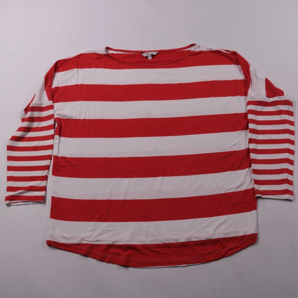 Лонгслив Next в красно-белую полоску, свободного кроя с длинным рукавом. Подойдёт для повседневных образов и многослойных сочетаний в прохладную погоду. Ткань на основе вискозы тянется за счёт эластана и комфортна в носке.