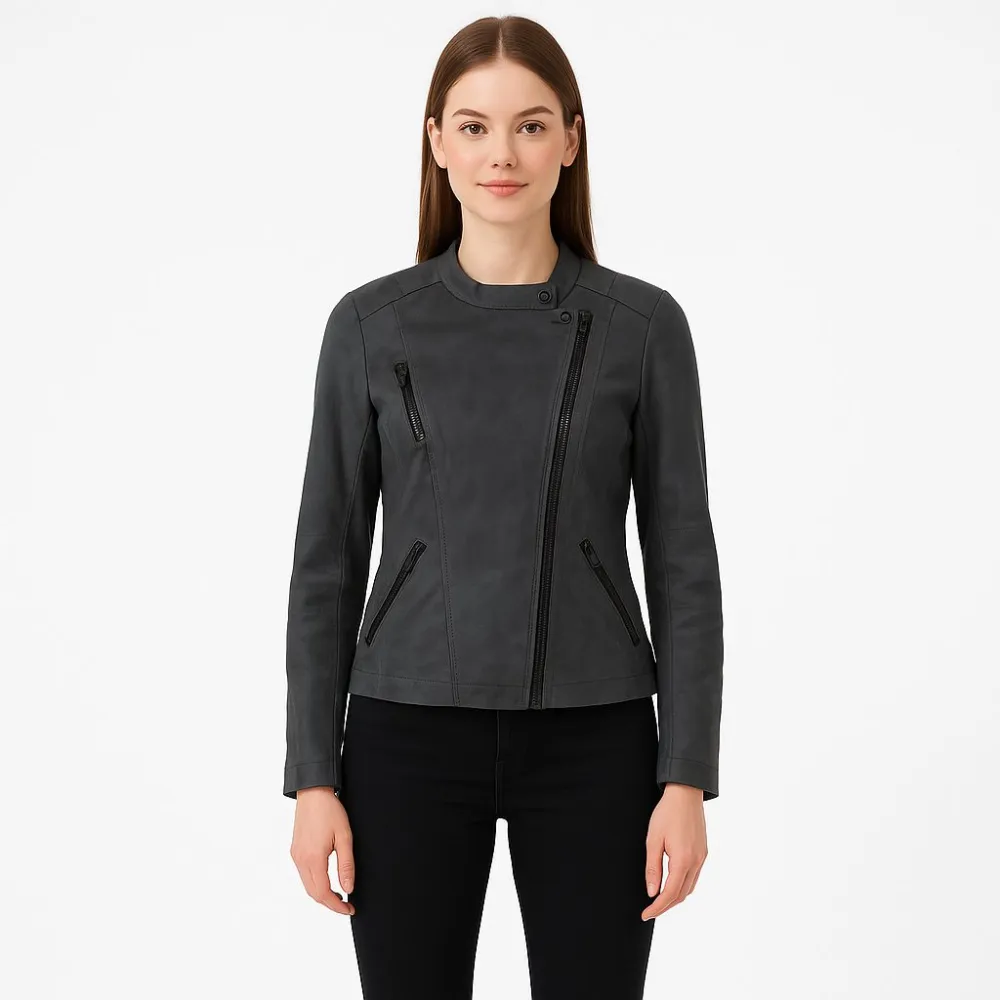 Женская куртка Only из эко-кожи в сером цвете, с асимметричной молнией и карманами на молнии. Подойдёт для повседневных образов в демисезон — с джинсами, брюками или платьями. Практична в носке: материал легко протирается и не требует сложного ухода.