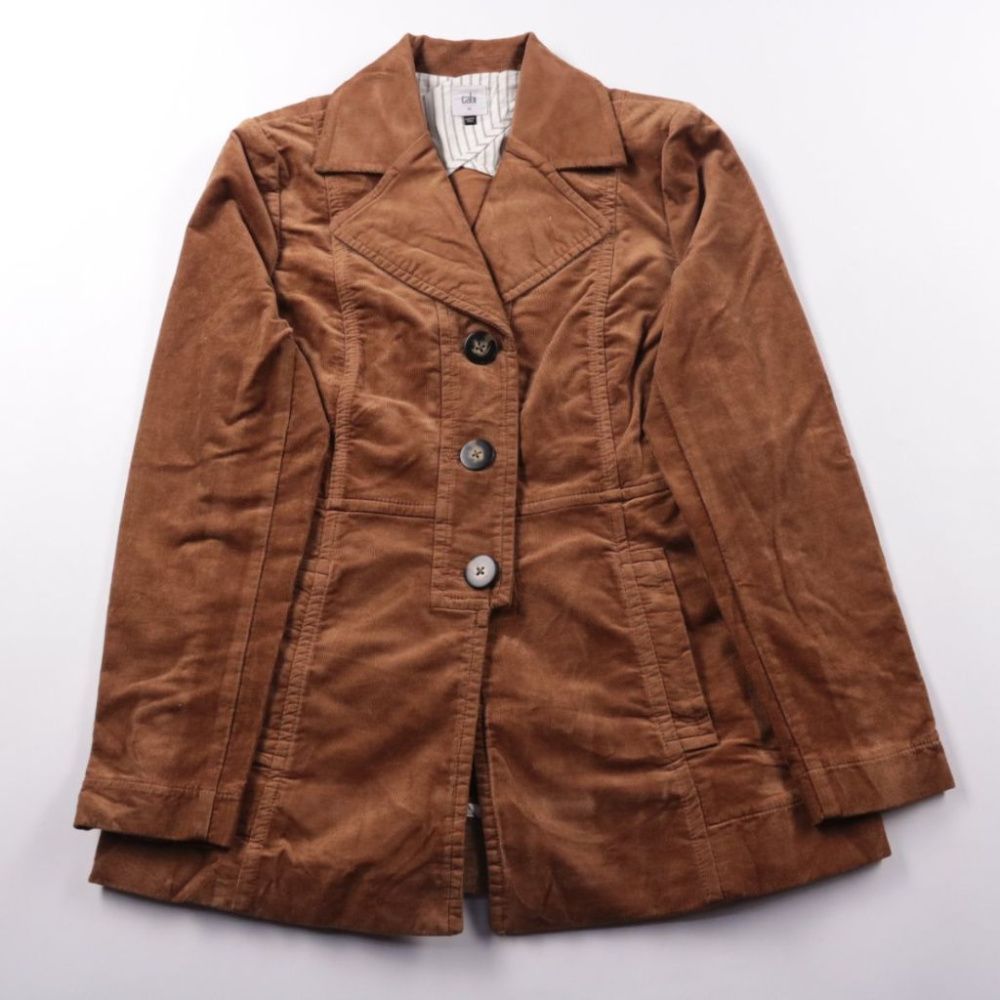 Женская лёгкая куртка Cabi в коричневом оттенке, выполнена из плотной ткани под вельвет с приталенным кроем и лацканами. Подойдёт для прохладной весны/осени и повседневных образов с джинсами или платьем. Практичное преимущество — удобная застёжка на пу...