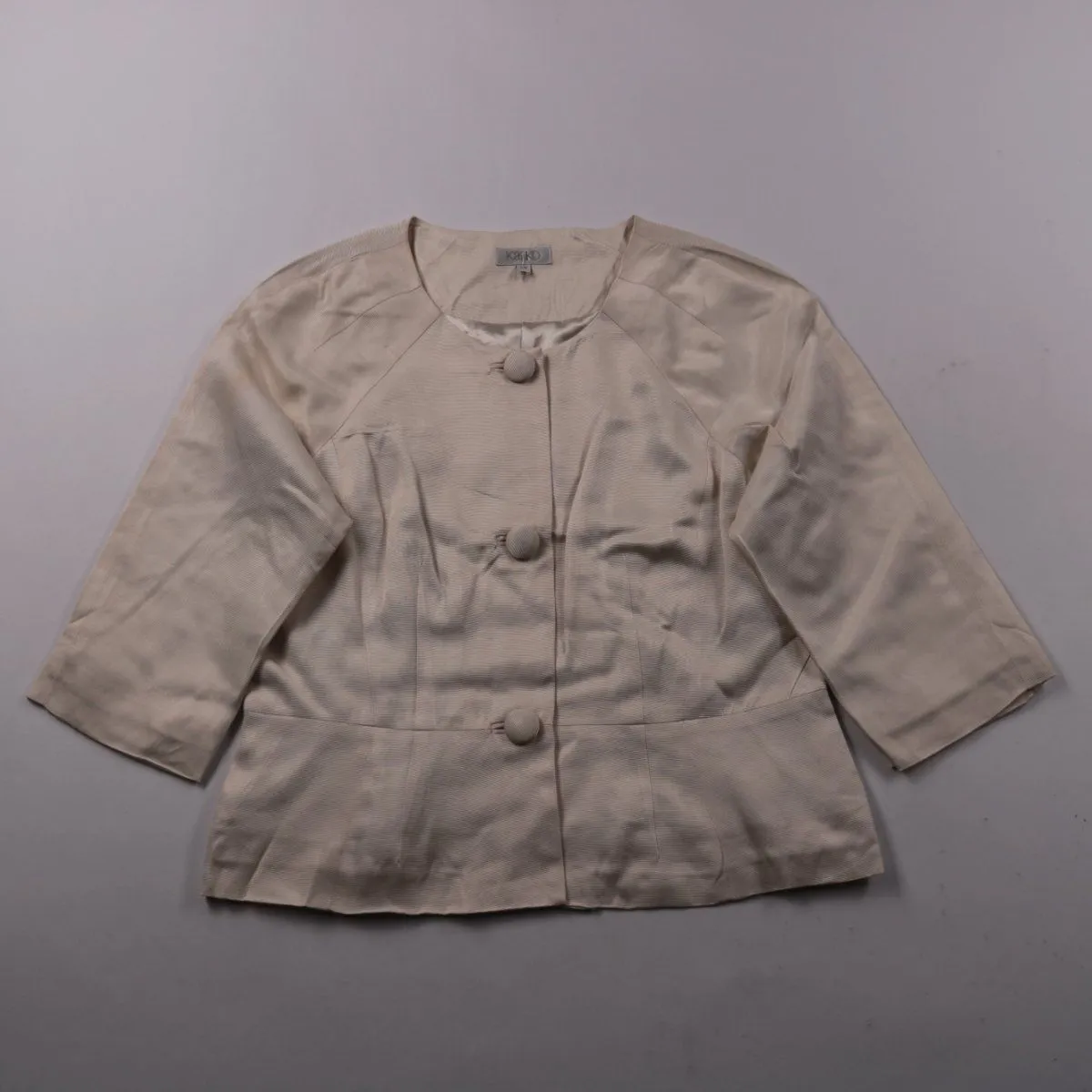 Лёгкий жакет Kaiko бежевого цвета с круглым вырезом и крупными обтянутыми пуговицами. Подойдёт для весны/осени и прохладных вечеров, хорошо смотрится с платьем или брюками. Есть подкладка, поэтому комфортно носится и держит форму.